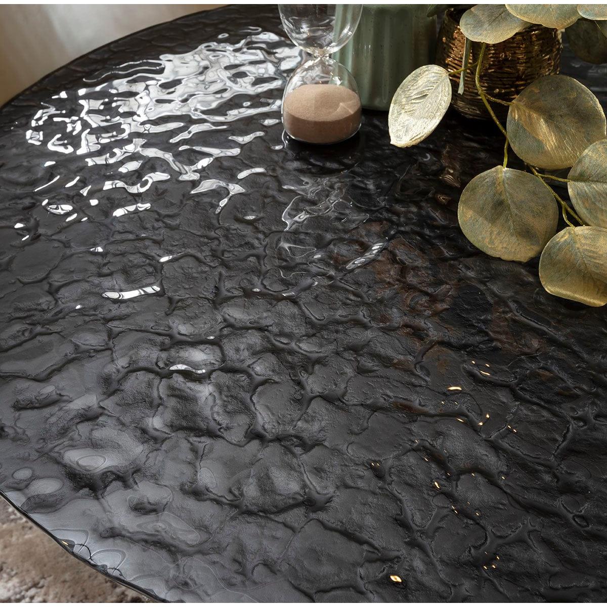 This round black coffee table combines luxury, style, and practicality in one stunning centrepiece. A modern round coffee table with a bold black and gold finish, it’s both elegant and functional. The dark round coffee table design adds depth and sophistication, making it an ideal modern black coffee table for any contemporary living space. A striking black and gold coffee table with a round silhouette and a sleek, modern design. Its black glass top features a unique melted texture, adding a tactile, artistic touch. The metal outer shell rises elegantly above the tabletop, creating a refined lip that ensures items stay neatly in place - a true statement piece. Crafted from 10mm thick tempered glass, this round coffee table in black offers impressive durability and strength. The table’s powder-coated metal shell in a champion gold finish wraps gracefully around its structure, complemented by an open lower shelf for added practicality. Built for everyday elegance, it’s a timeless piece of modern design. W100cm D100cm H41cm Tempered glass top Matching side table available