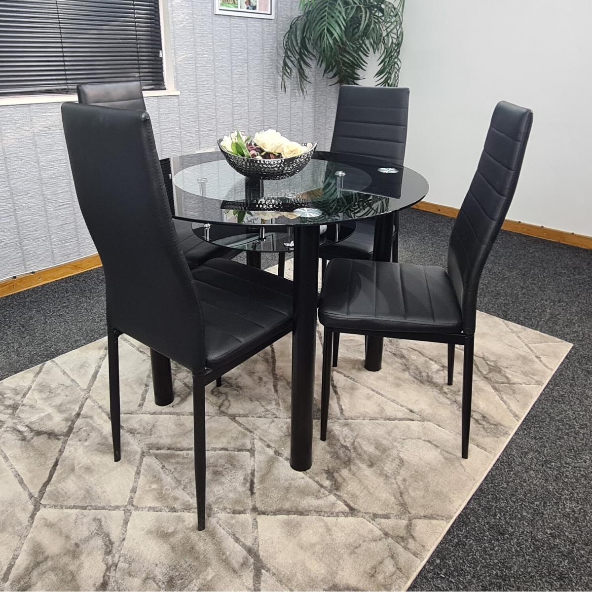 This round black glass dining table with four chairs is a versatile piece that lends itself well to modern and contemporary interiors. I love its sleek, minimalist look, which can instantly update a space and create a stylish focal point. It works particularly well in smaller dining areas or open-plan kitchens where space needs to be maximised. For practical styling, consider contrasting the black glass with colourful or textured tableware, or soften the look with a patterned table runner or placemats. Pairing it with chairs in different fabrics or colours can also add visual interest, while keeping it neutral makes it easy to adapt over time with new accessories or decor themes.