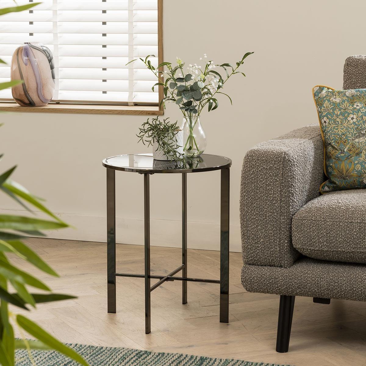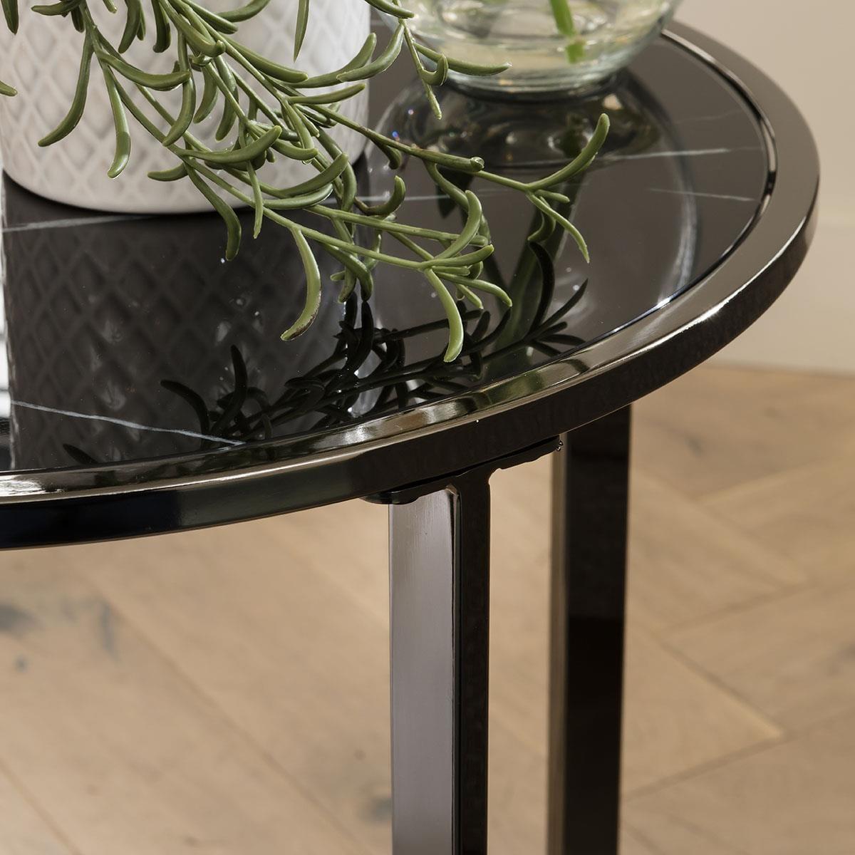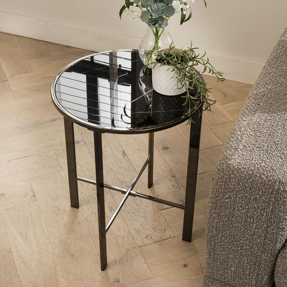 Add a sophisticated statement to your living area with this beautiful Quatropi Round Side Table. crafted in a minimalist design with a marble-look glass table top, it will introduce a sense of subtle sophistication into your home. With its sturdy metal frame and circular table top, this side table can be used alone as a lamp table, or as a convenient end table in the living room. This gorgeous combination of colours and materials really sets this side table apart from the rest, the nickel plated frame contrasts with the black glass marble-effect top - perfect for neutral interiors and bringing a splash of class and creating a statement area in your room. If you need more information about this product, use the Live Chat service to speak to the team or send us a message. Spread the cost our with interest-free finance options. Minimum spend applies. W45cm D45cm H55cm Modern Round Black Lamp Table This side table has a sturdy black nickel-plated metal frame with black marble-effect glass top