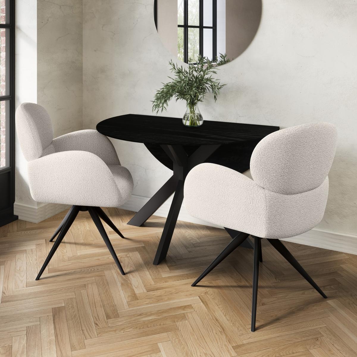 This 2-seater dining set brings timeless style and everyday functionality into perfect balance. The round oak veneer table is supported by a bold black starburst metal base, creating an eye-catching centrepiece for your dining room or kitchen space. Its clever folding design allows you to extend the table with ease—perfect for everything from weekday meals to weekend gatherings. The neutral bouclé swivel chairs feature cocoon-like curved backrests that offer both comfort and style, making every sit-in feel relaxed and supported. Built for modern living, the chairs effortlessly rotate for dining, working from home or casual lounging, adding versatility to your space. The smooth black legs of the chairs complement the table’s metal base, creating a balanced, design-forward look that suits both minimalist and retro-inspired interiors. This extendable dining table and swivel chair set brings the perfect blend of comfort, flexibility and timeless design. The swivel chairs offer ease of movement and a supportive sit, while the table’s extendable feature ensures you’re always ready for extra guests. Thoughtfully crafted with stylish details and practical finishes, this set brings effortless charm and functionality to your everyday moments.