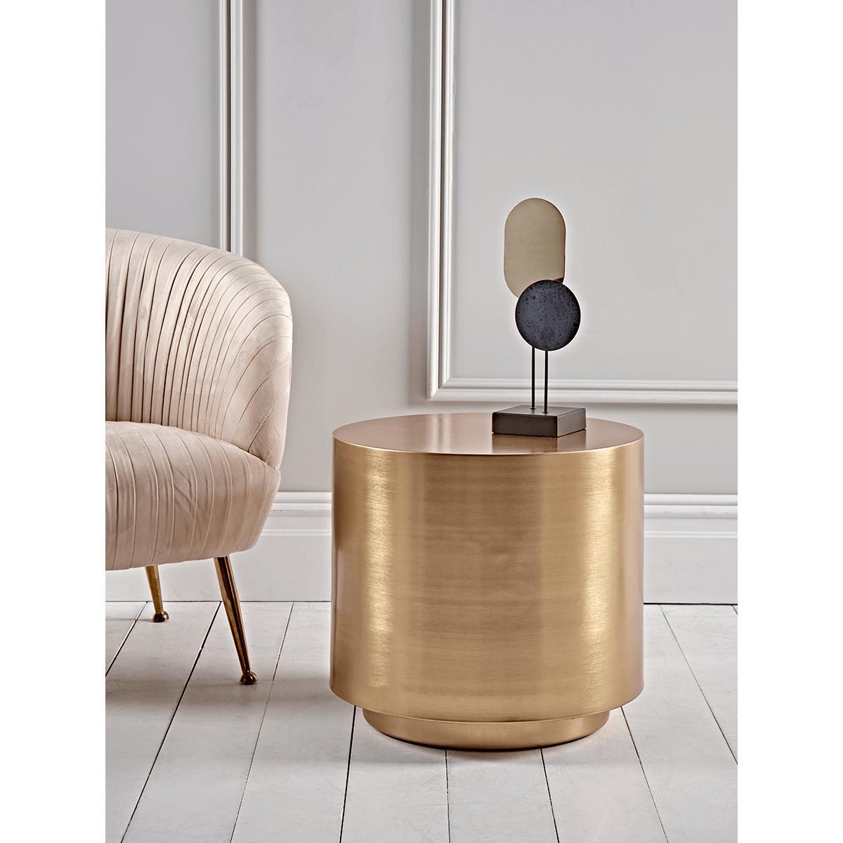 I love this round brass side table for its sleek, modern appeal and versatile style. Its warm metallic finish adds a touch of sophistication, making it suitable for both contemporary and eclectic interiors. It works especially well in living rooms, beside plush armchairs, or as a bedside table in a bedroom. Practical styling tips include pairing it with minimal accessories like a small lamp, a stack of favoured books, or a decorative vase to highlight its understated elegance. Its rounded shape encourages a softer, more inviting atmosphere, and its compact size makes it an ideal choice for smaller spaces or for creating layered surfaces in larger rooms.