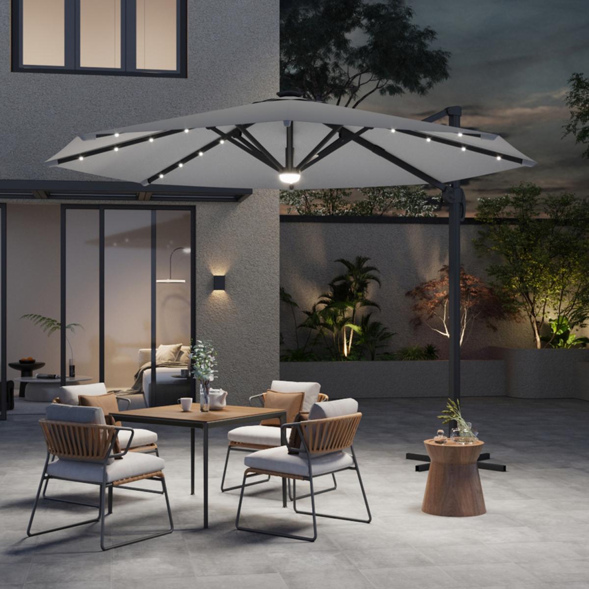 Round Cantilever Parasol with Solar LED Light Feature - Light Grey