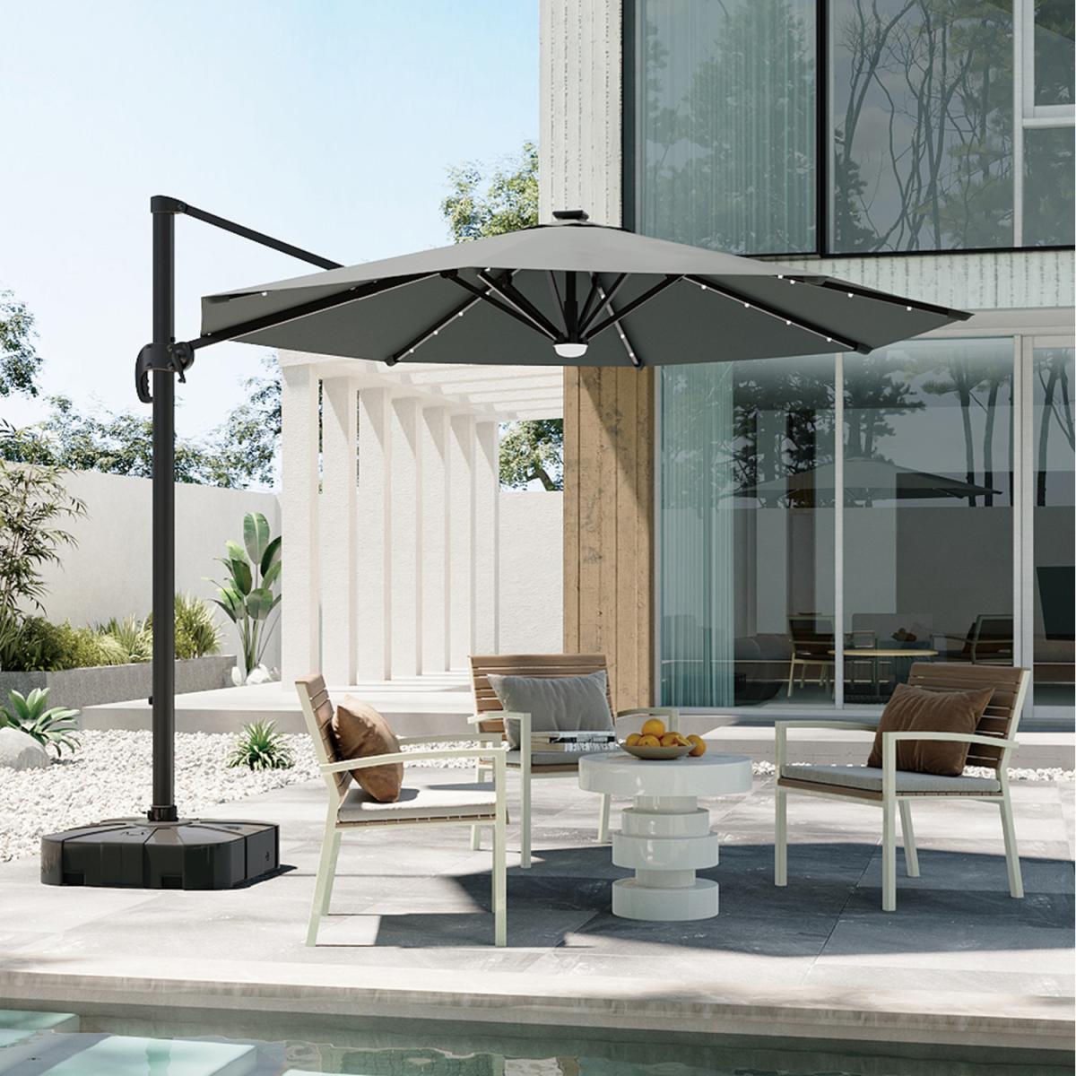 A quality parasol can provide long-lasting protection from the sun and rain, and this one does just that. Made from durable polyester fabric with a polyurethane coating, the canopy offers excellent water resistance, chemical resistance, and durability against wear, making it ideal for outdoor use. Its non-stain-absorbing surface also means it requires minimal cleaning and maintenance. This parasol is highly versatile, featuring a 360-degree rotating base, while the crank mechanism and adjustable handle let you easily customise the angle and height without having to move the parasol. In the evening, the built-in solar panel powers LED lights on the ribs, providing ambient lighting for night-time use. With a stable and sturdy structure and multiple base options to choose from, this parasol ensures reliable sun and rain protection by day and creates a cosy, romantic atmosphere by night. A great choice for enhancing your outdoor living space.