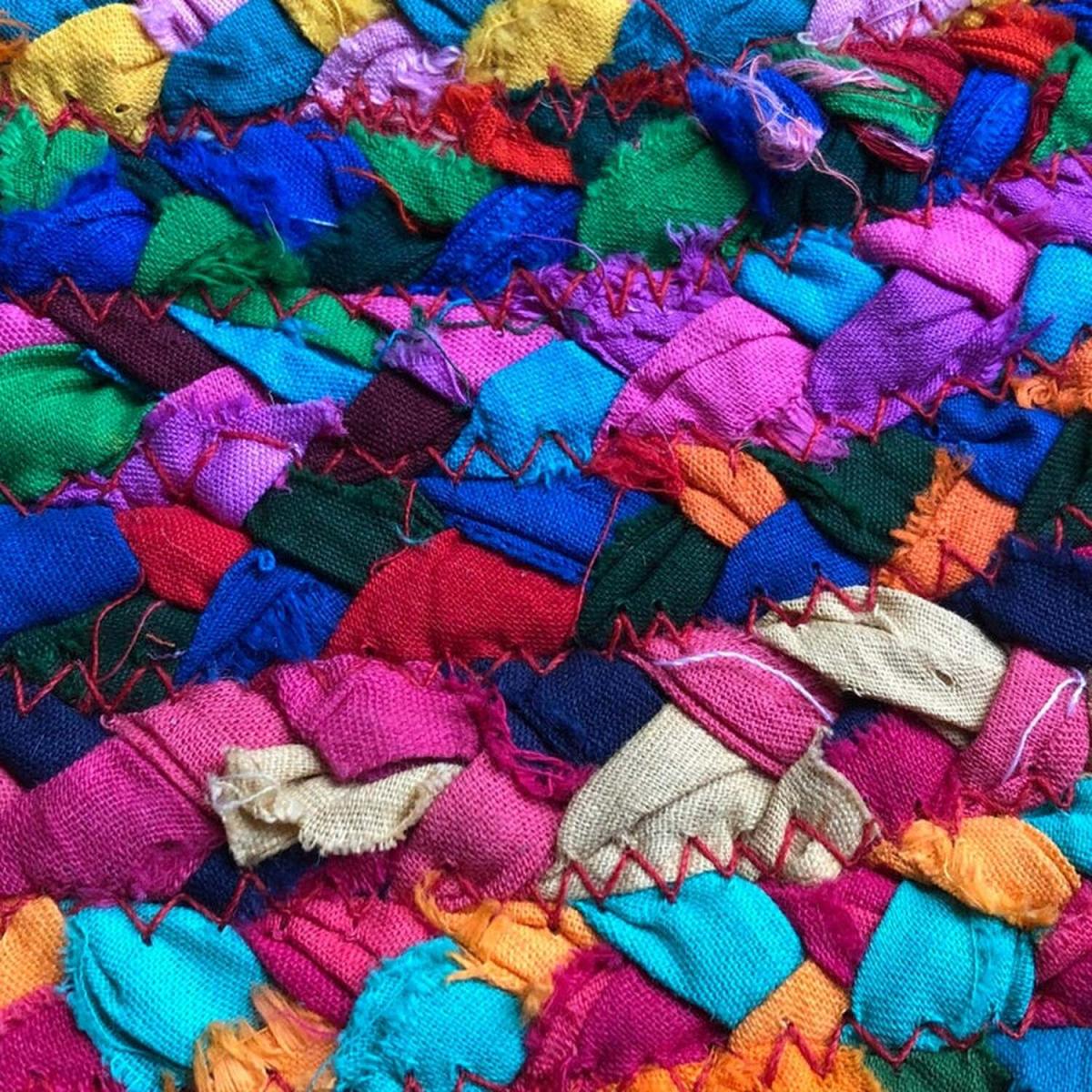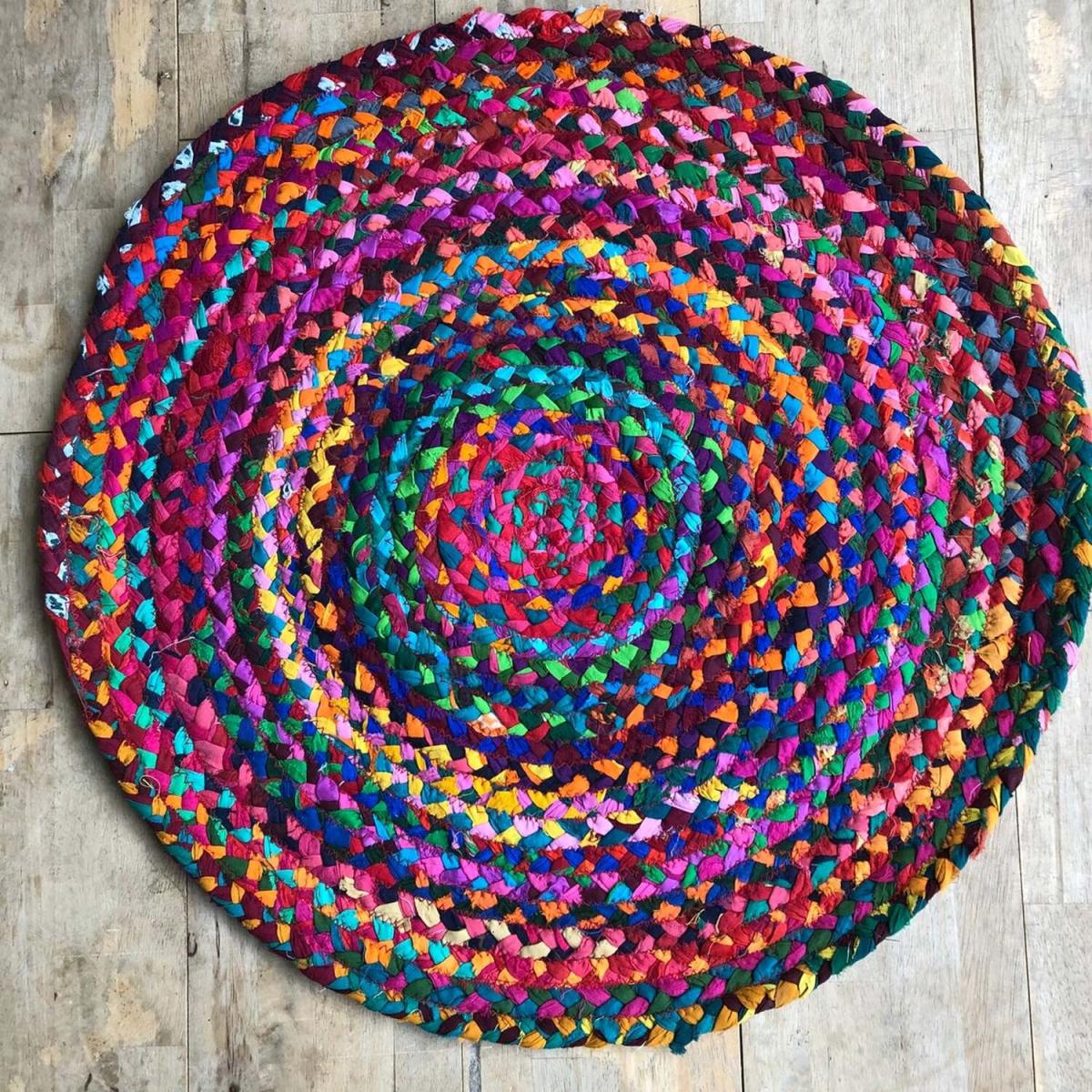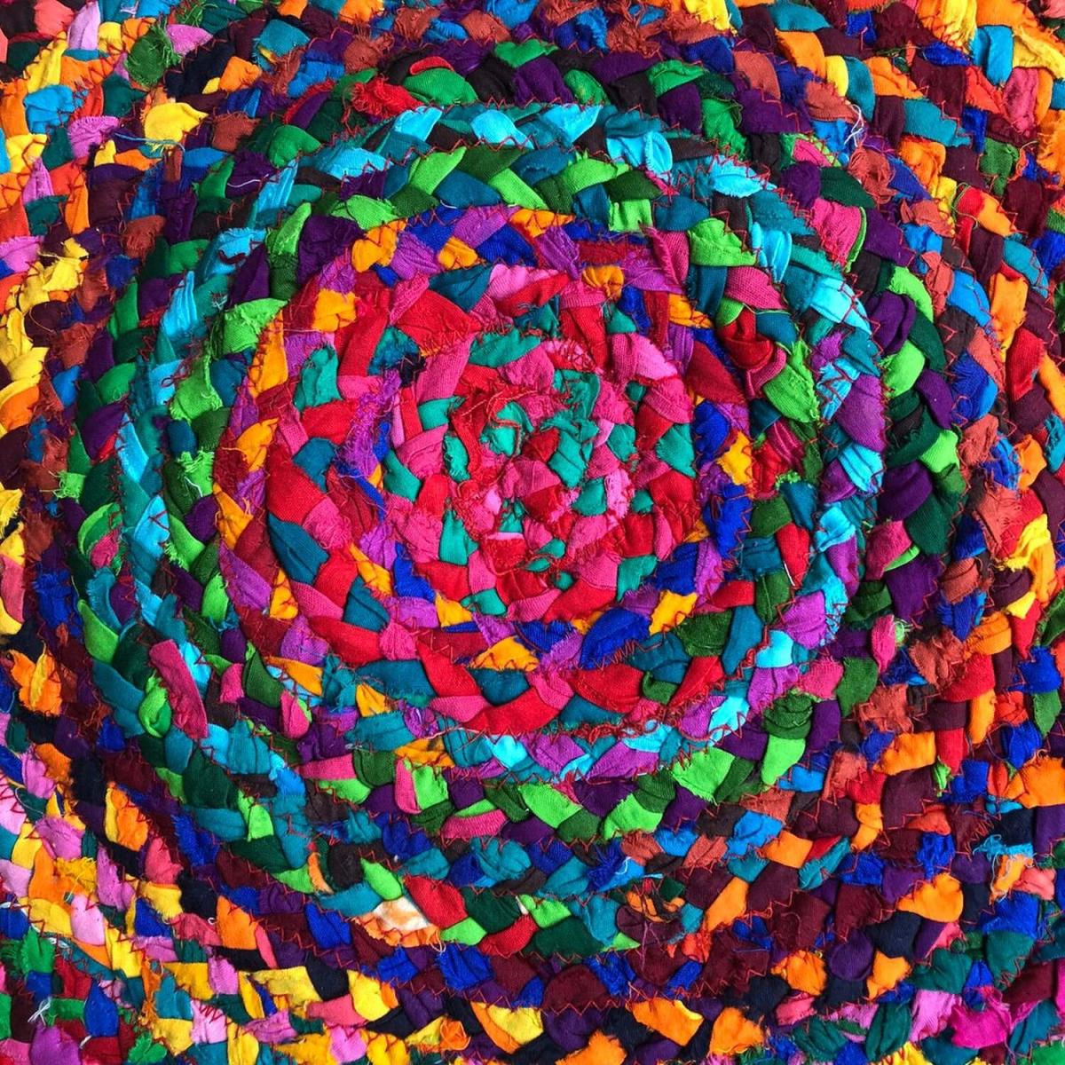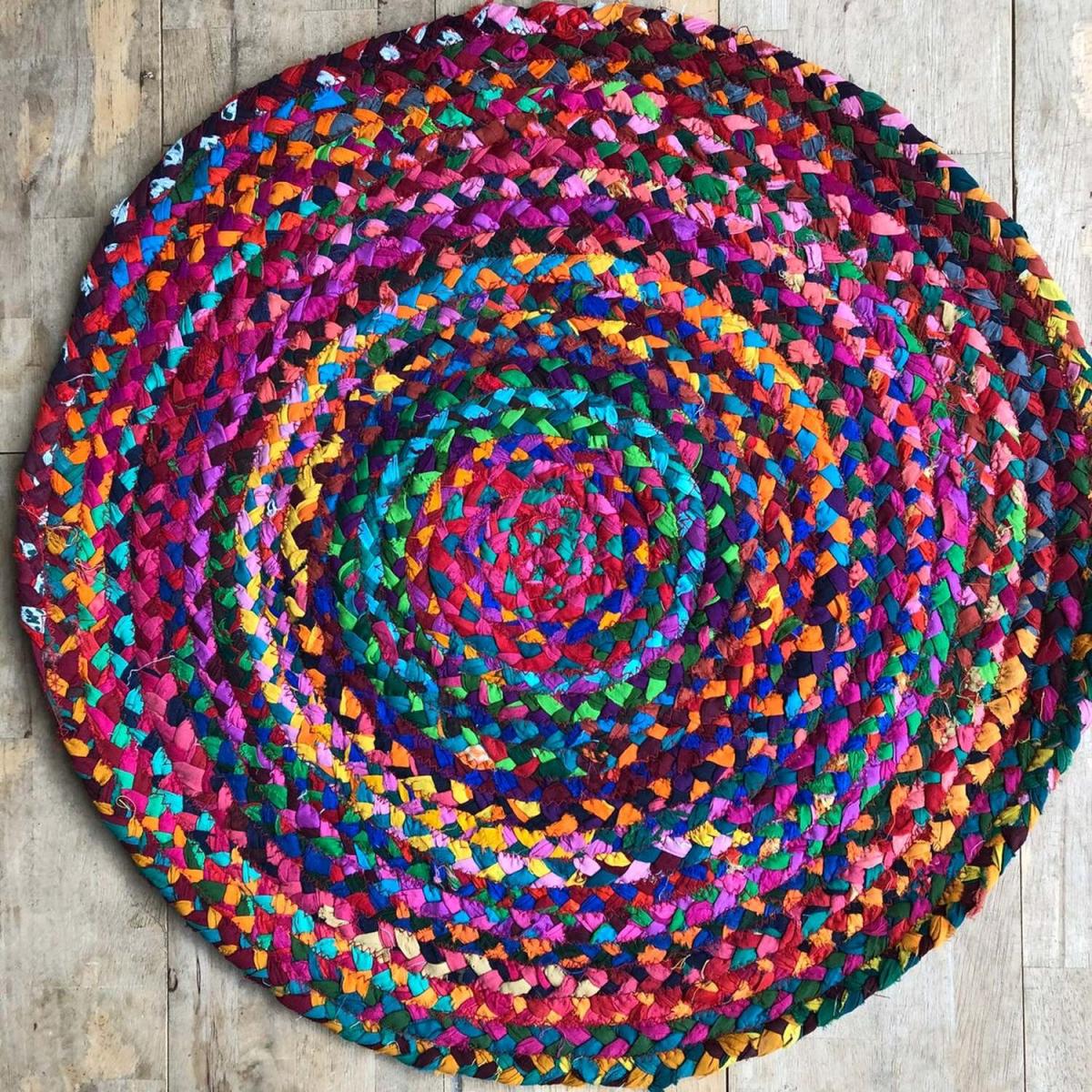 This colourful and cheerful chindi braided rug is made from 100% recycled cotton waste. The cotton is dyed and then is braided by hand , a fun and environmentally friendly way to bring colour to a room. size 60cm x 60cm each one is handmade so no two rugs will be the same.