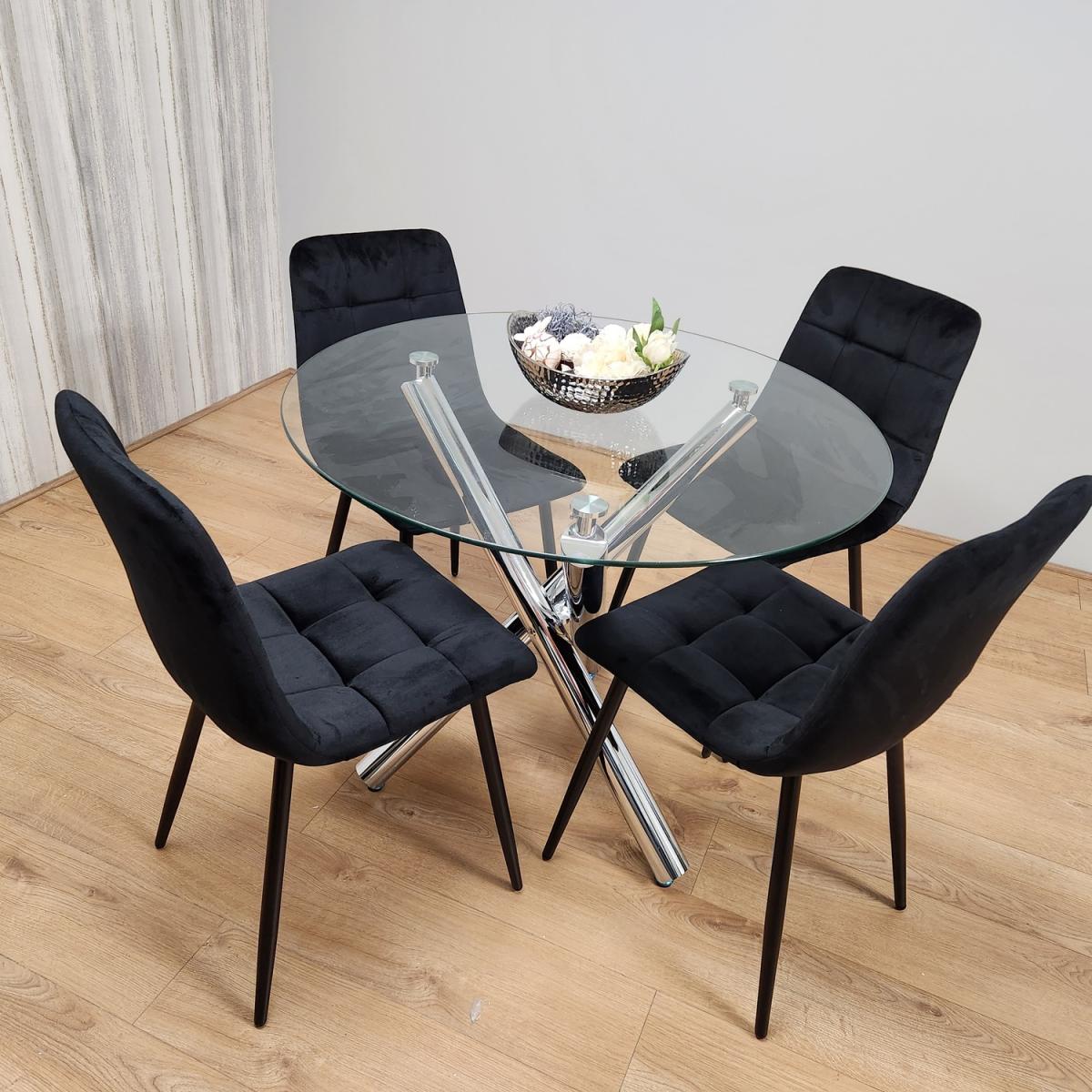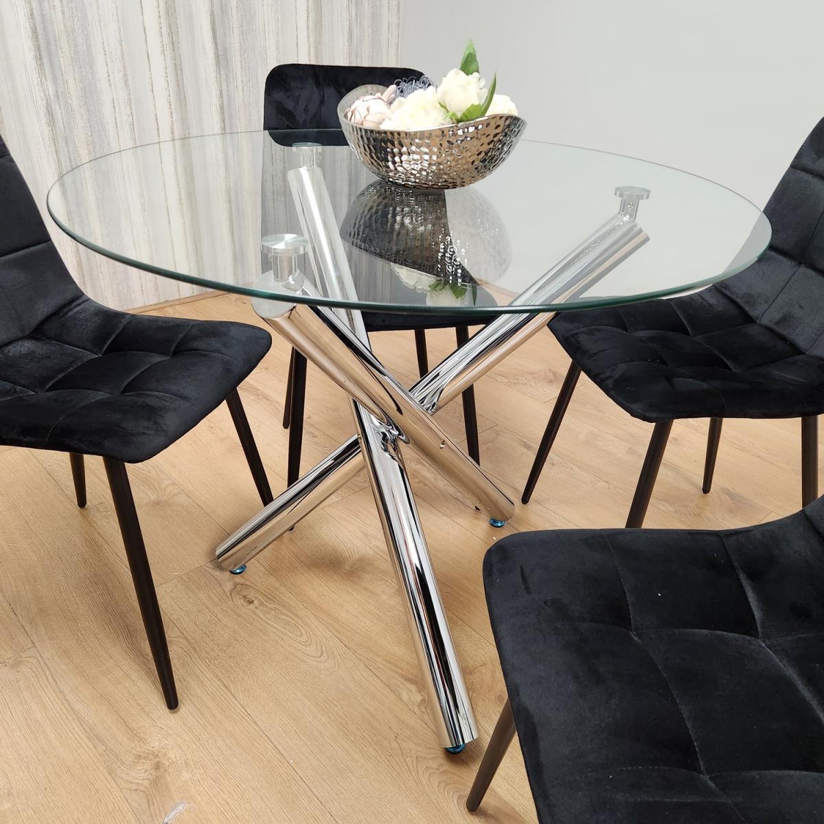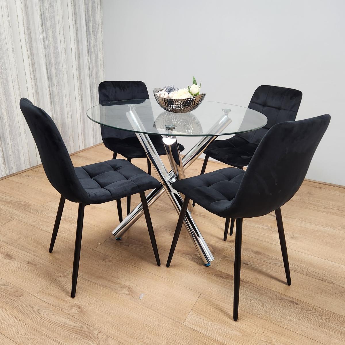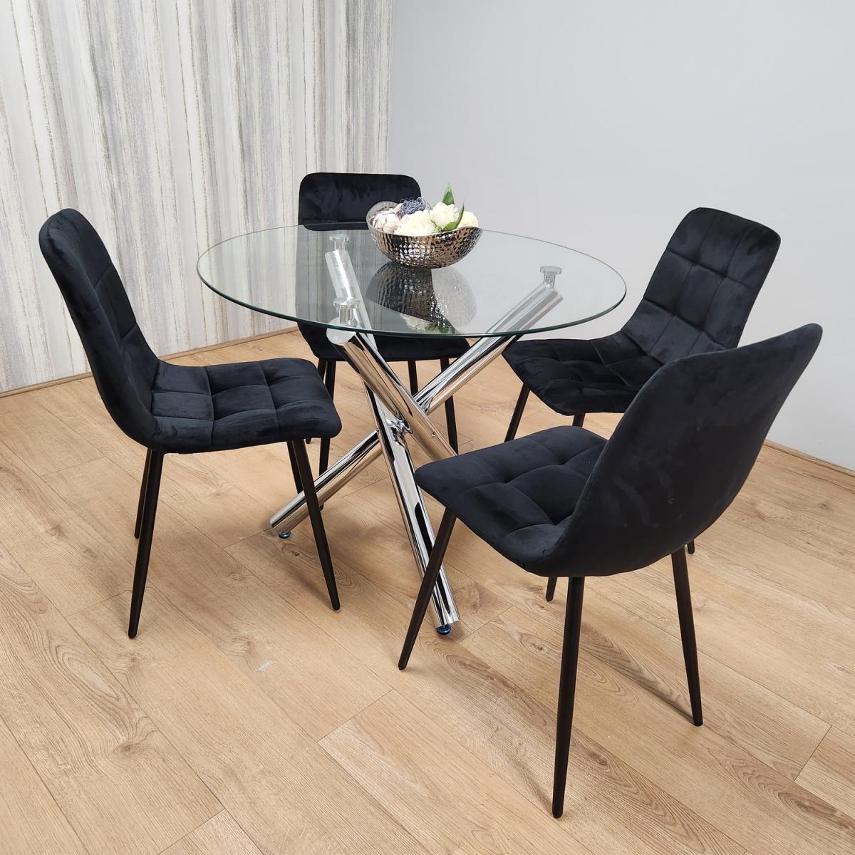 This dining table stylishly combines chrome and glass for a minimalist, contemporary design that won't overwhelm your dining room. The tempered glass top is easy wipe/clean meaning your table will stay looking brand new for years to come! The strong cylindrical chrome legs offer plenty of support whilst the top is made from hardened tempered safety glass. Easy to Assemble With clear, step-by-step instructions and all the fixings required. This table really is capable of being a centerpiece in any home! Table Size: 90 x 90 x 75cm (LxWx. H). Chair Size: 44 x 59 x 87cm (LxWx. H).