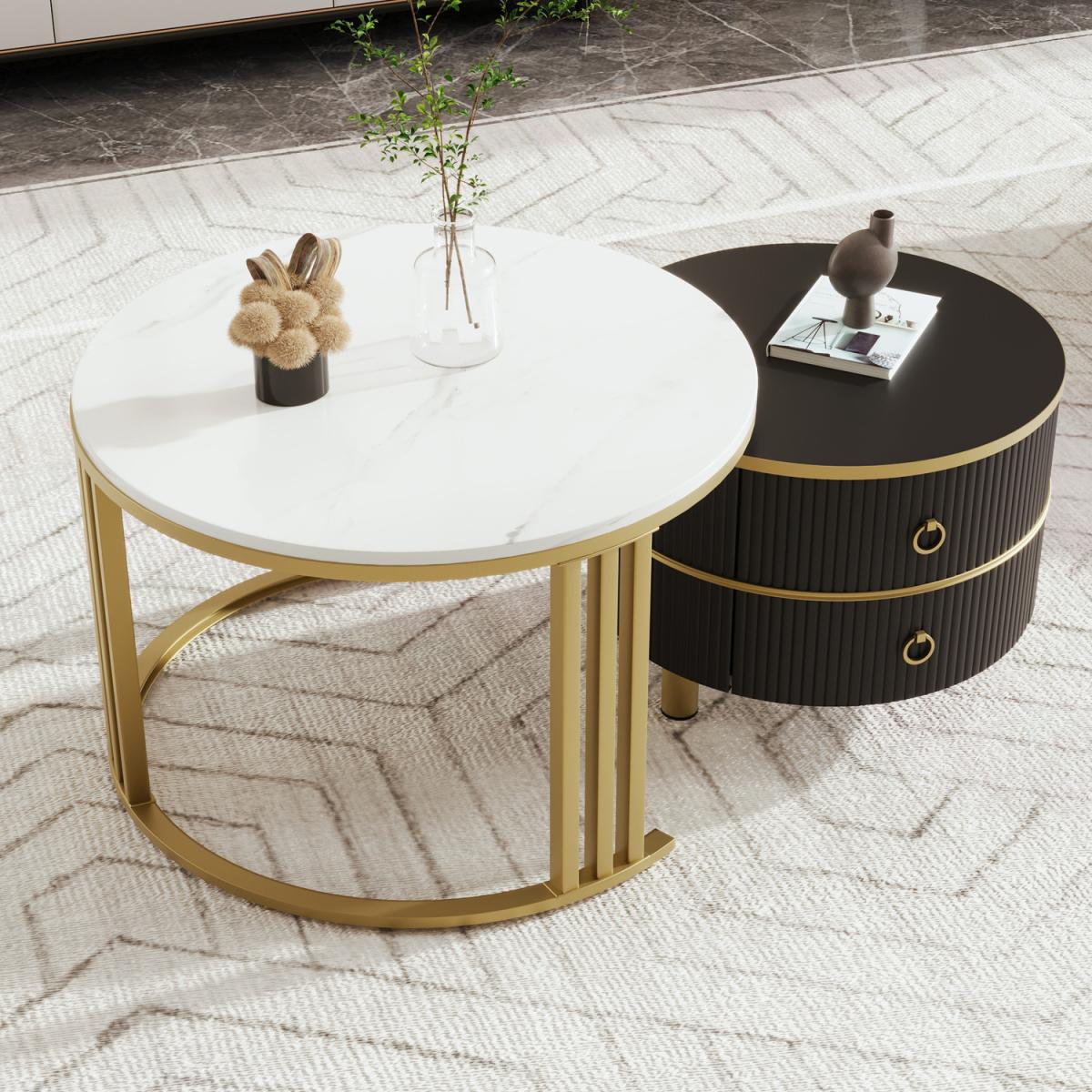 Light luxury style: the marble pattern and high-gloss table top create an elegant and luxurious atmosphere for this set table, and the unique texture of the drawers makes your home more artistic and suitable for your modern interior design. Suitable for various home scenes: The double round coffee tables can be used together to save space or separately as two coffee tables. Can be placed in front of or next to the sofa, study, balcony, etc. Reliable quality: The round table is made of MDF and plastic, ensuring good stability and chemical resistance. The smooth MDF surface is easy to clean and maintain. Dimensions:Overall dimensions: Large table - 70 x 70 x 46 cm, small table - 50 x 50 x 40 cm. LOTS OF STORAGE: The 2-piece coffee table set has two drawers and two work surfaces, giving you plenty of storage space and a degree of privacy. Description If you want to add a modern touch to your apartment/home, try using this coffee table as an accent. The unique combination of marble pattern table top and high gloss table top is chic and elegant. Painted metal legs and textured drawer fronts reflect the owner's taste and style, adding value and style to the product. Thickened MDF and thickened metal legs also ensure the stability of the table. You can use it for a long time without hesitation. The easily wipeable surface makes your everyday life easier. Sales points Sturdy and reliable Made of MDF + metal legs that ensure sufficient stability for home use. Exquisite design This product has a marble patterned table top (not made of marble), high gloss table top and lacquered metal legs. The colours can be perfectly matched. Also, the layered drawer surface adds an artistic touch to the coffee table. Ingenious design The coffee table consists of two round tables that can be used independently or combined in different living scenes. Space-saving coffee table The design size of this coffee table is 70 x 70 x 46 cm/50 x 50 x 40 cm, which is very suitable for small spaces. Lightweight yet stable. Flexible enough to move around. If you live in a studio flat or dormitory, this side table is a good choice.