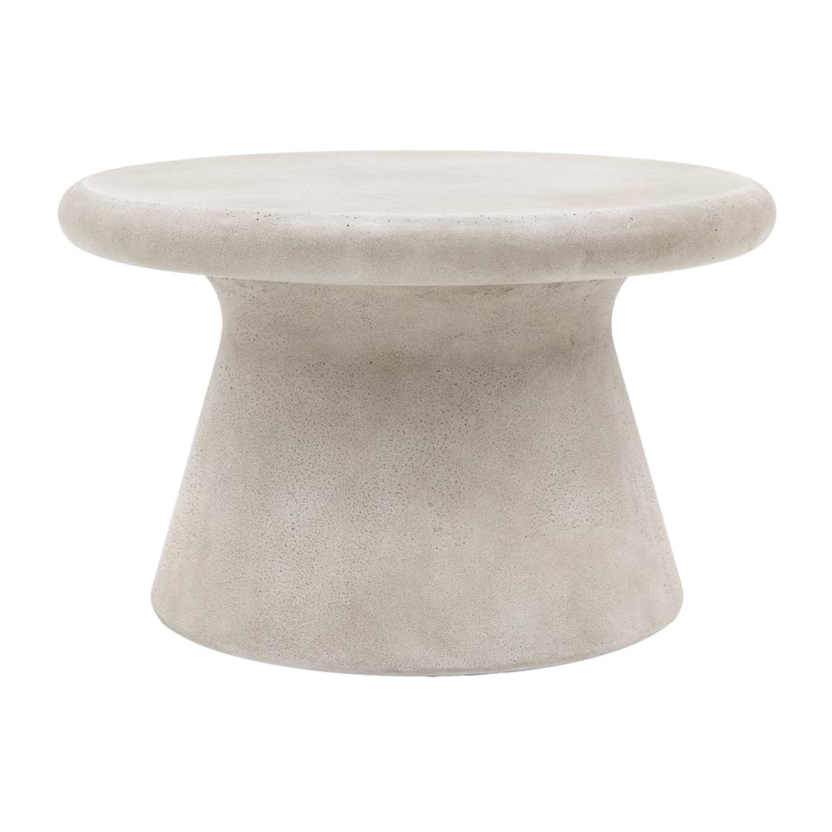Dimensions:W65 x D65 x H40 cm This contemporary coffee table is made using GRC moulded technology to create this lovely flowing shape. It is finished to the highest quality standard in concrete look. Also offered in a gloss cream finish and matching side tables are available. Features: Concrete Round Cream finish Matching items available