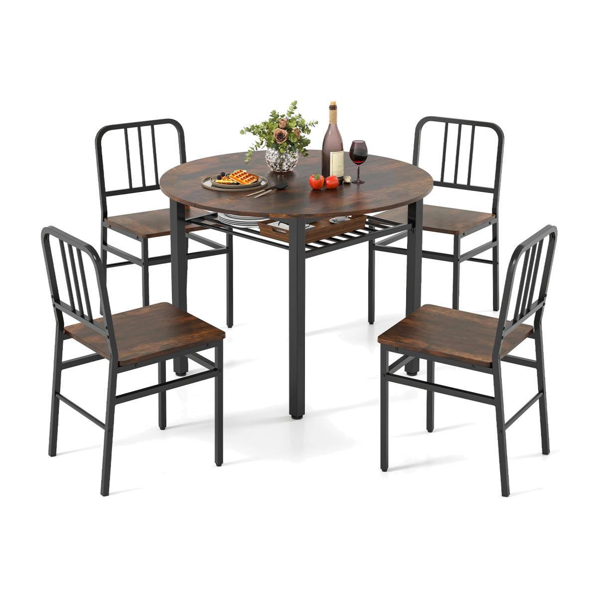 The kitchen chairs in the compact 5-piece dining set are ergonomically designed for an enjoyable dining experience. Moreover, the chairs can be conveniently tucked away underneath the table post-meal, making it perfect for smaller dining areas or intimate spaces. Additionally, the dining table set comes with a cleverly integrated storage rack beneath it, allowing you to efficiently arrange your dining necessities for easy access. Constructed with a robust metal frame, both the table and chairs offer exceptional durability and steadiness.
