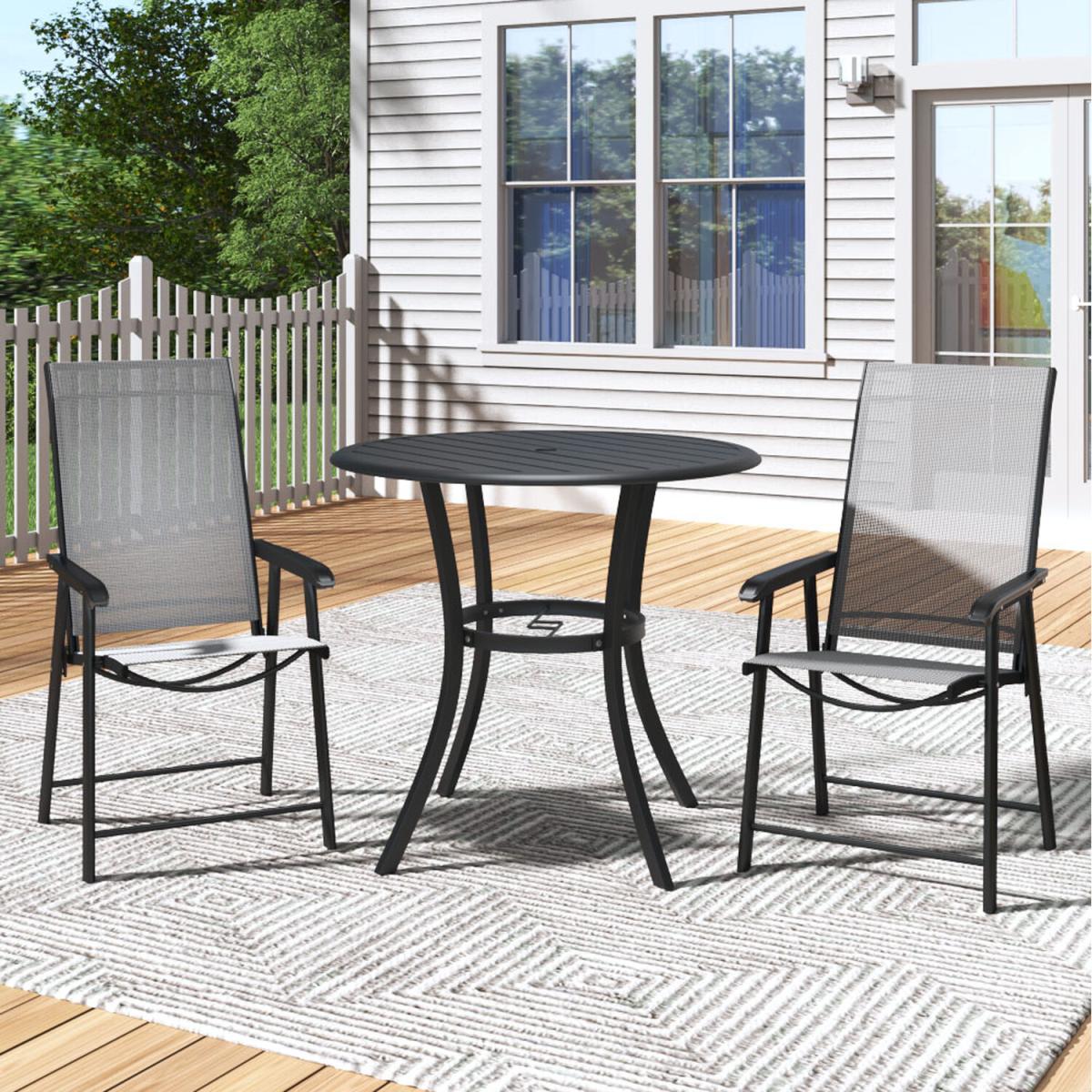 Whether used indoors or outdoors, this metal dining table offers a perfect space to enjoy time with family and friends. The smooth surface is easy to clean and maintain, while the sturdy metal construction ensures long-lasting stability and durability. Designed with a parasol hole in the centre and a base that supports the parasol, it's ideal for creating a relaxed outdoor setting with shade. For indoor use, the table is equipped with non-slip pads to reduce floor friction. This dining table is available in three options. You can choose to purchase just the table, or opt for the table with either 2 folding chairs or 2 stackable chairs, each featuring a similar design style. The table with chairs make it easy to create a cohesive, comfortable, and stylish space for dining or relaxation. Whether as a dining table or a coffee table, its sleek design and robust metal structure make it a stylish and practical choice for any setting.