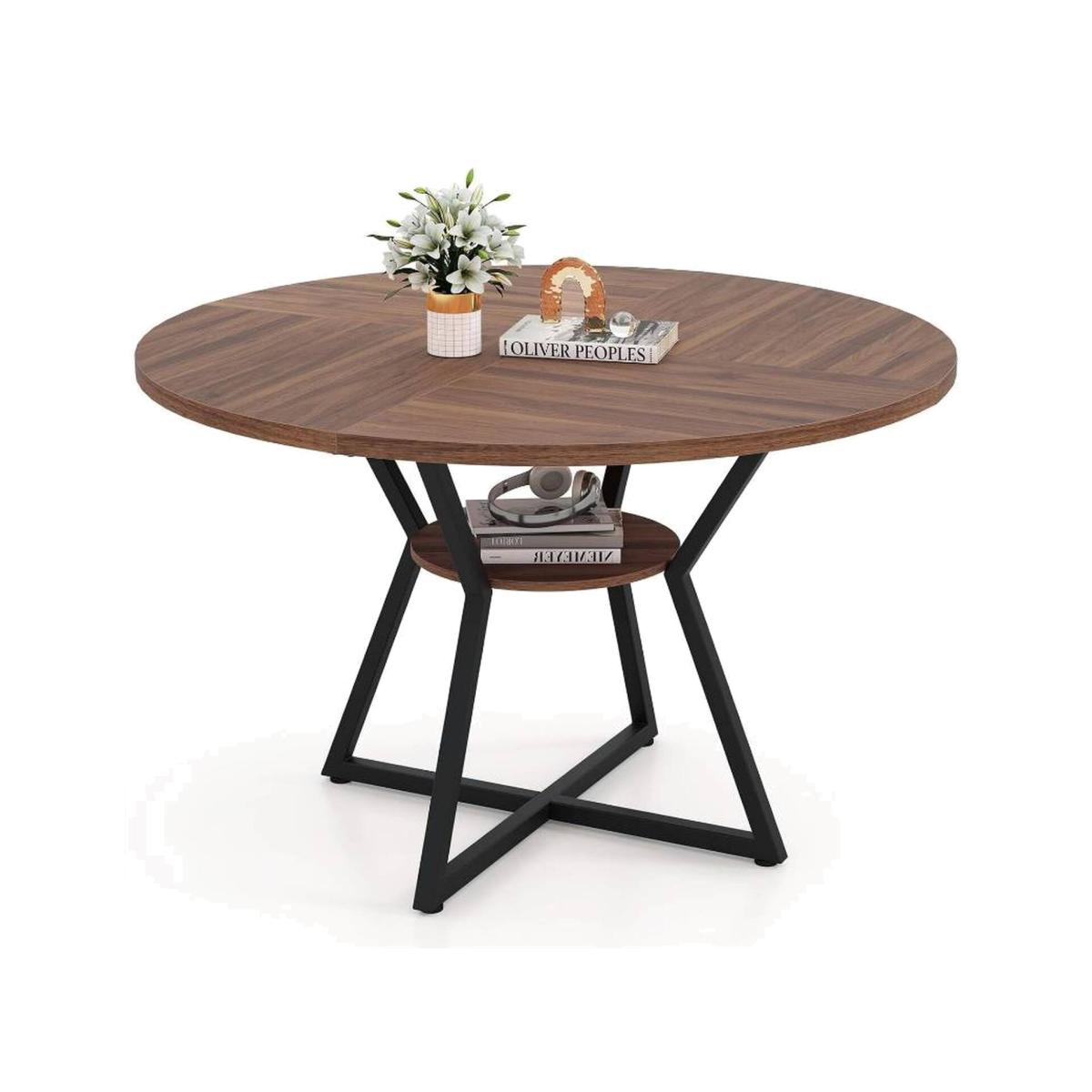 Our round dining table, measuring 118 x 77 cm (Dia. x H), is perfect for seating up to 6 guests comfortably, making it an ideal centrepiece for social gatherings, family dinners, or game nights. The circular design not only facilitates natural engagement and conversation among diners but also anchors your dining space with its aesthetic appeal. Constructed with a robust X-shaped metal frame, this table guarantees stability and durability, complemented by adjustable foot pads that ensure it remains balanced on any surface, protecting your floors from damage.