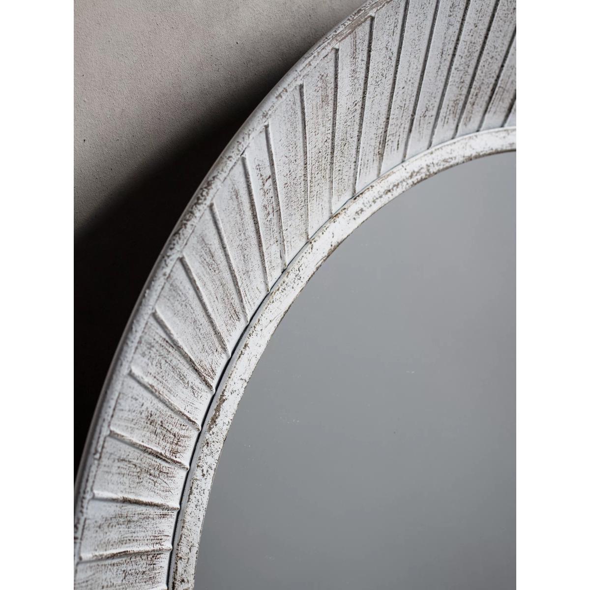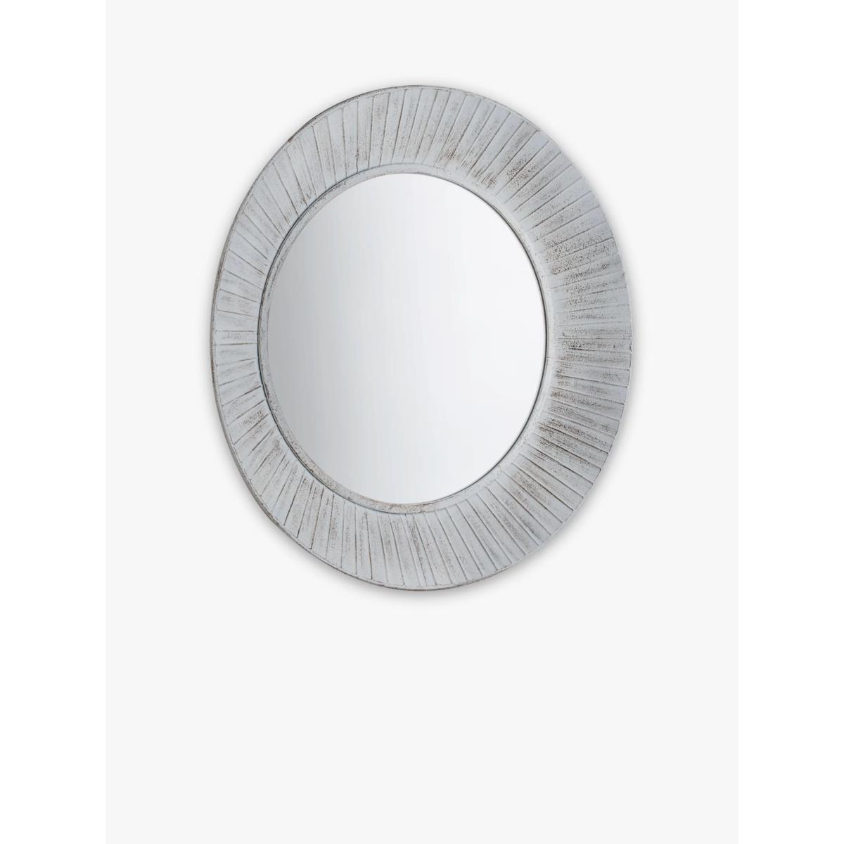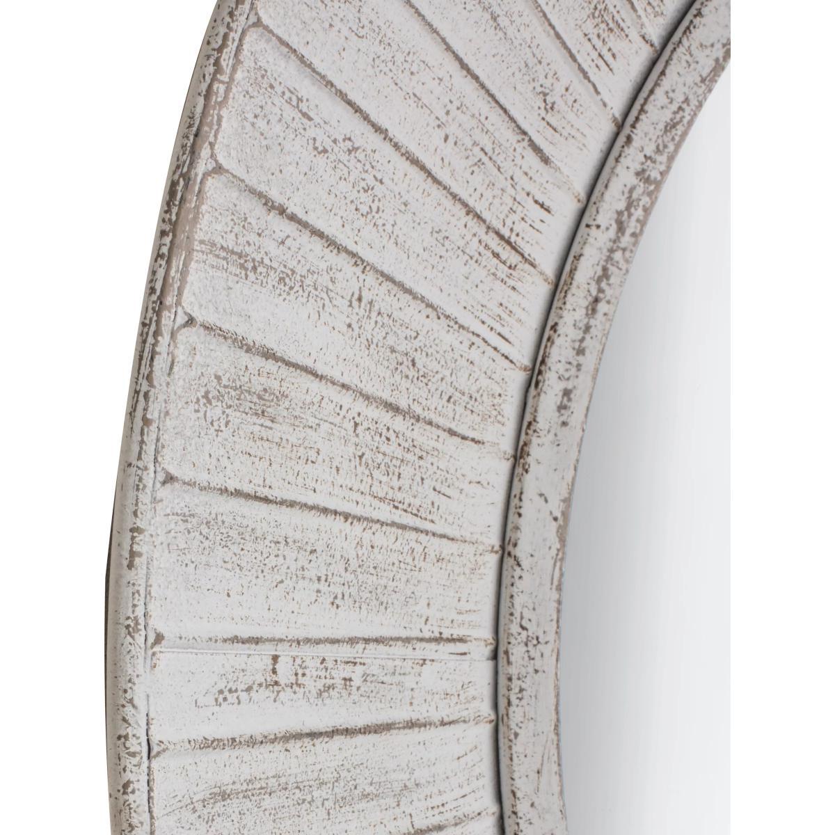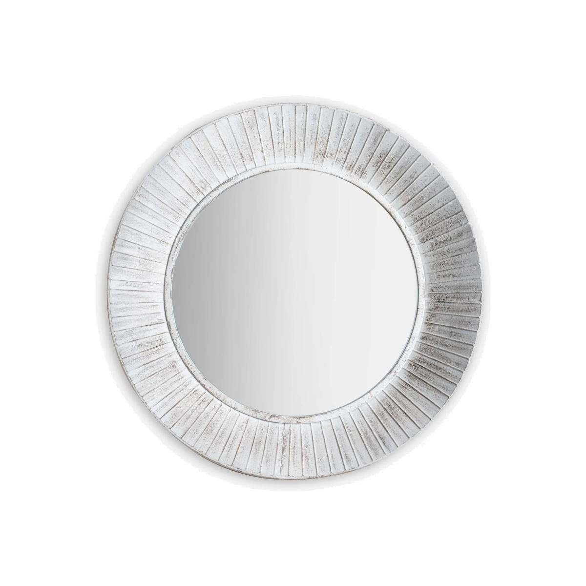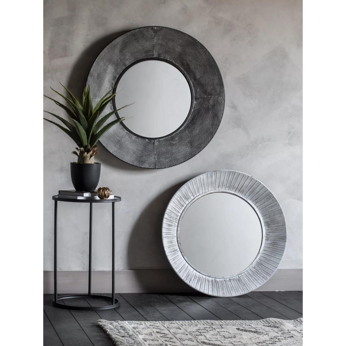 A radial design, this round wall mirror has textured lines on the frame with a distressed finish. It's ready to hang on your wall using the keyhole fittings on the back of the mirror.