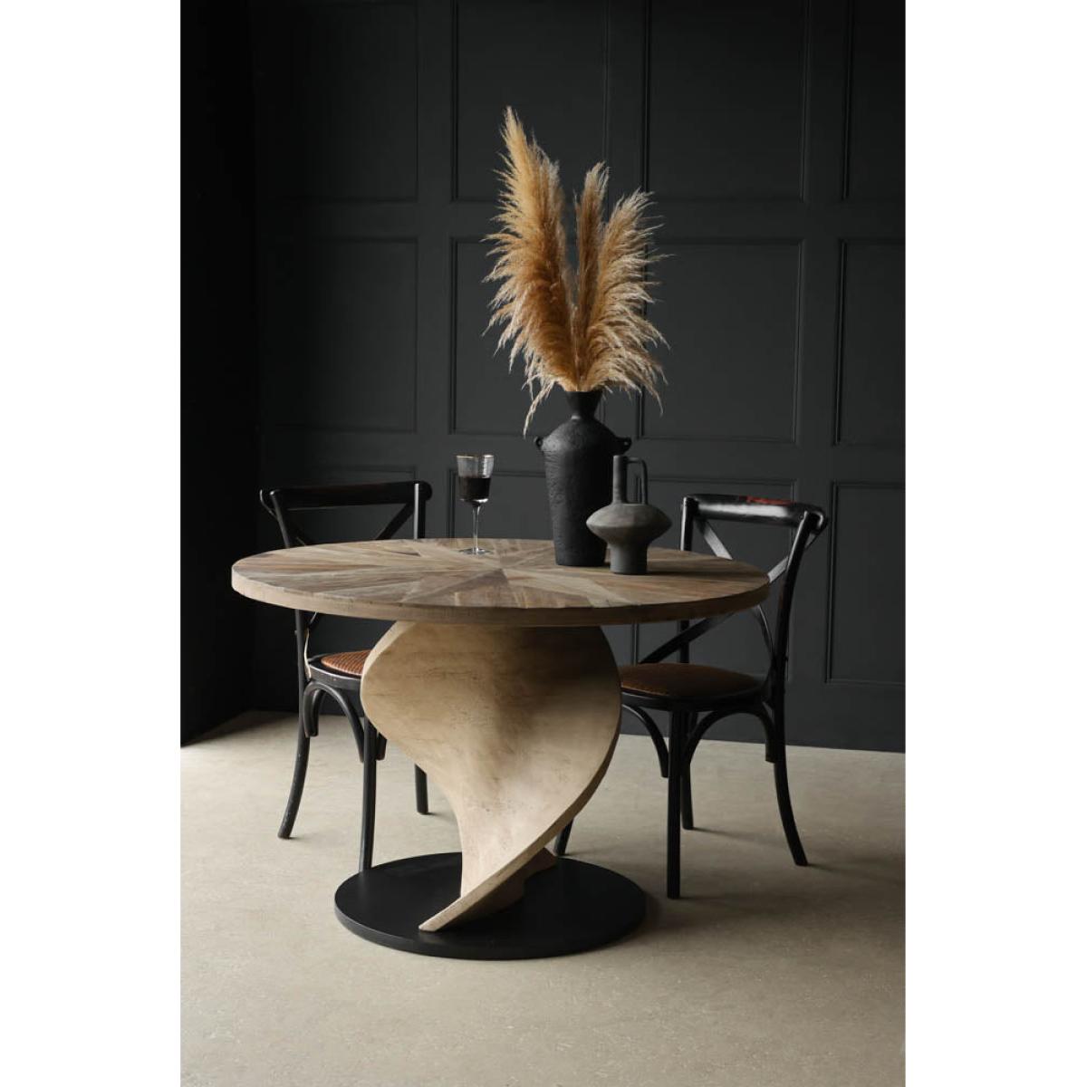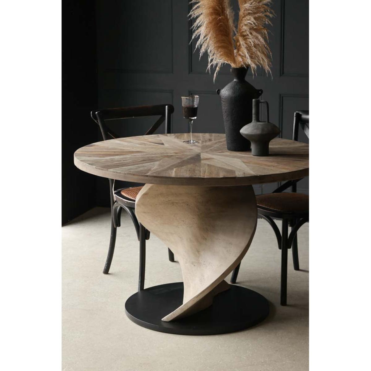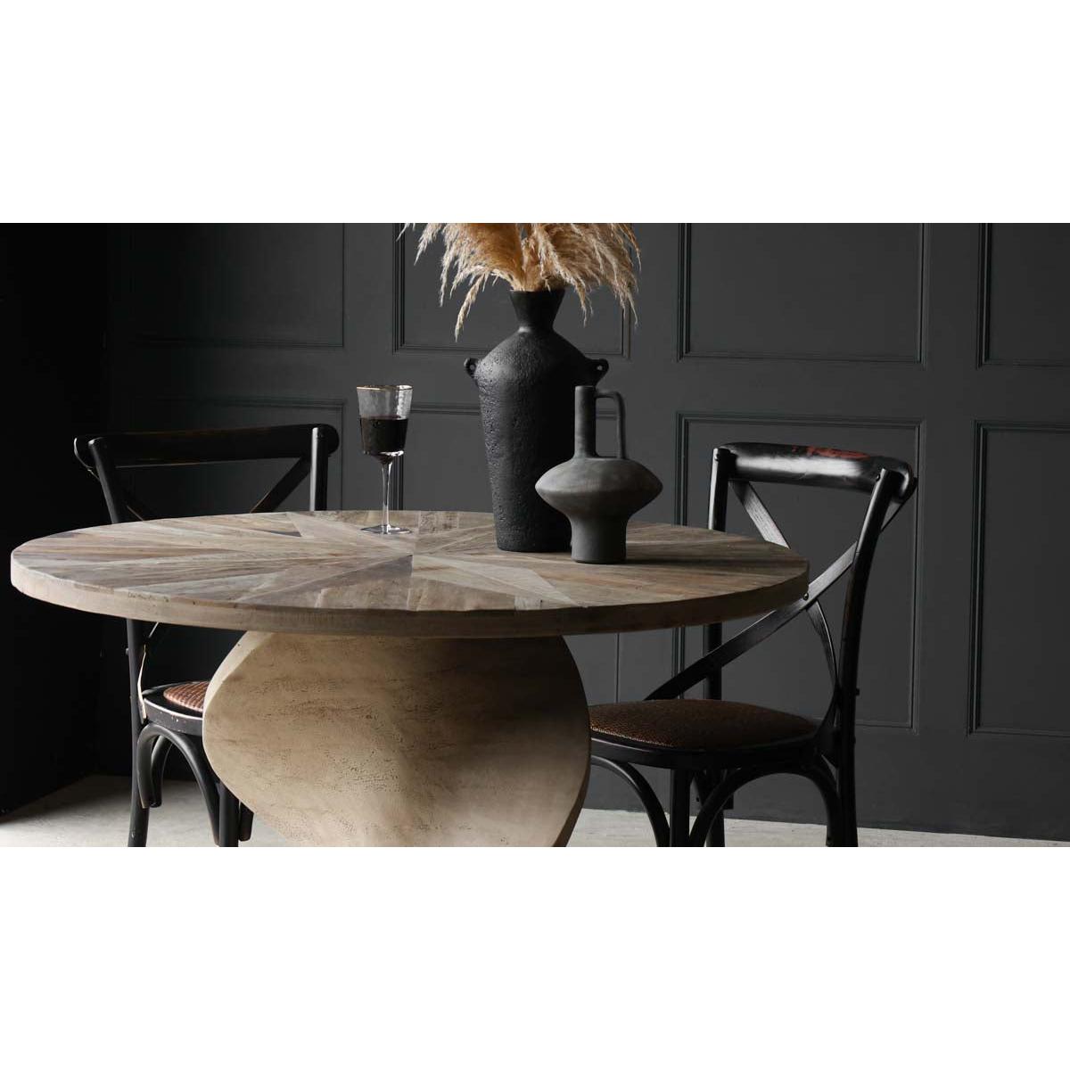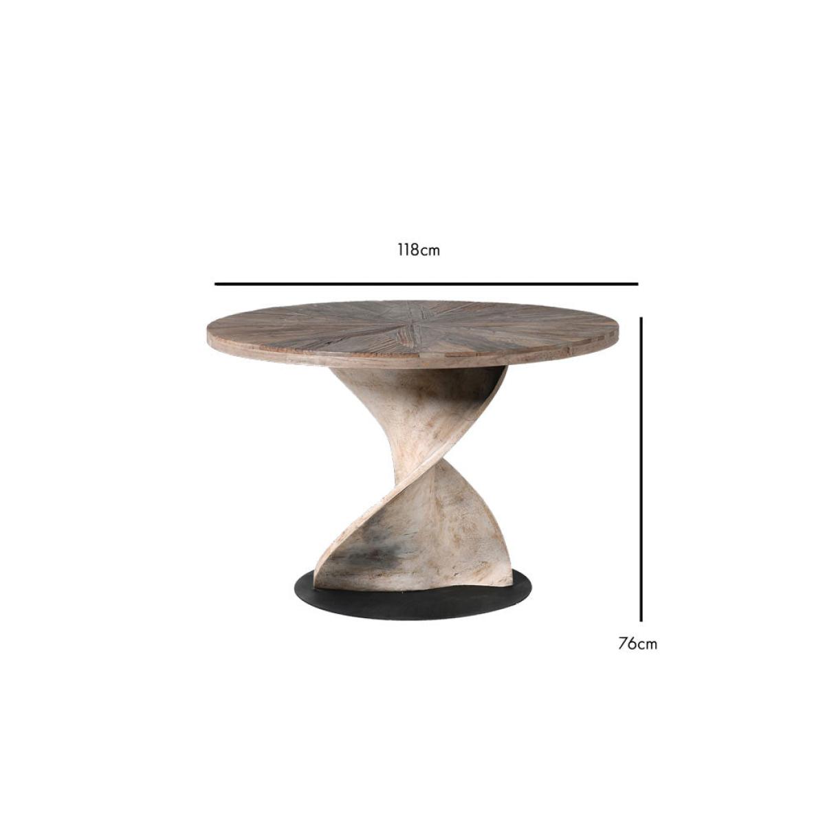 About The Round Elm Twisted Dining Table The Round Elm Twisted Dining Table is a true hero piece for your home. Made with recycled elm, the top of the table features a beautiful star pattern within the wood and is paired with a statement twisted pedestal and black metal base. Measuring 118cm in diameter with a height of 76cm, this statuesque wooden dining table promises to be the stand-out feature of any room. Why We Think You’ll Love The Round Wood Dining Table With Twisted PedestalAs the setting where all the best conversations happen, your dining table is an incredibly important part of the home and deserves to be the centre of attention. Pairing beautiful wood inlay patterns with an eye-catching spiral pedestal, the Round Elm Dining Table is a bold investment piece that is worth every penny. Beautifully crafted with every attention to detail, this is a dining room table that will be treasured in your home for many years to come. How To Style The Recycled Elm & Metal Round Dining TableThe Round Elm Twisted Dining Table looks amazing against dark dramatic walls, light and bright spaces or natural paint palettes; from fresh plaster to terracotta and rich forest green. Style yours with plates of delicious food and large glasses of wine, and sit all your favourite people around the table for fabulous evenings that will live on in your memory.