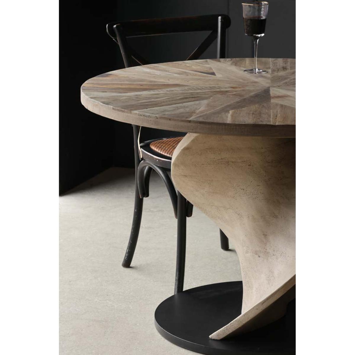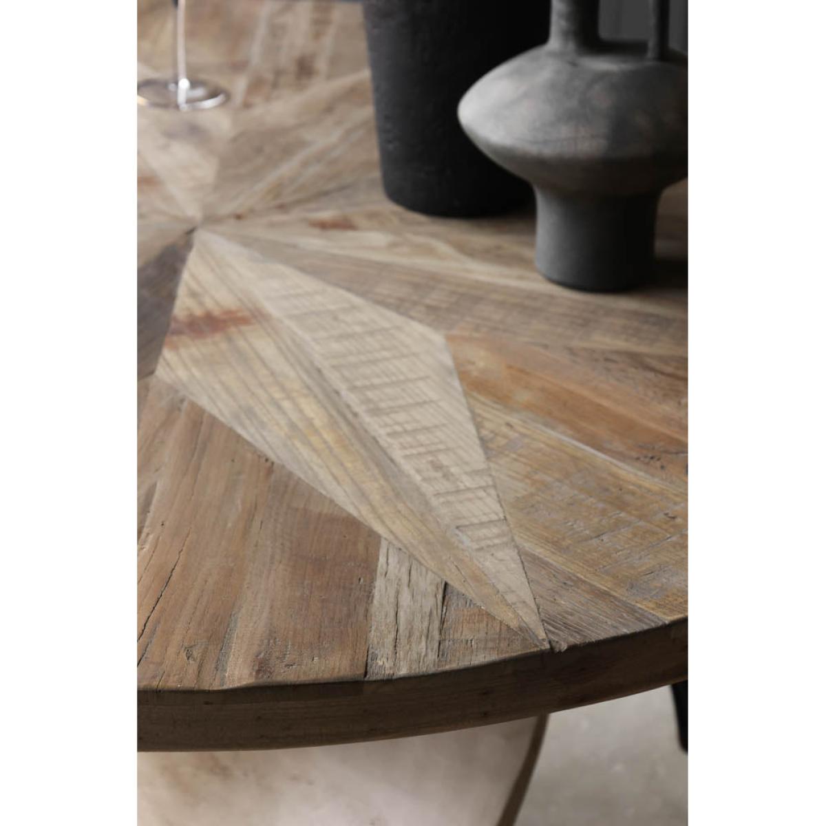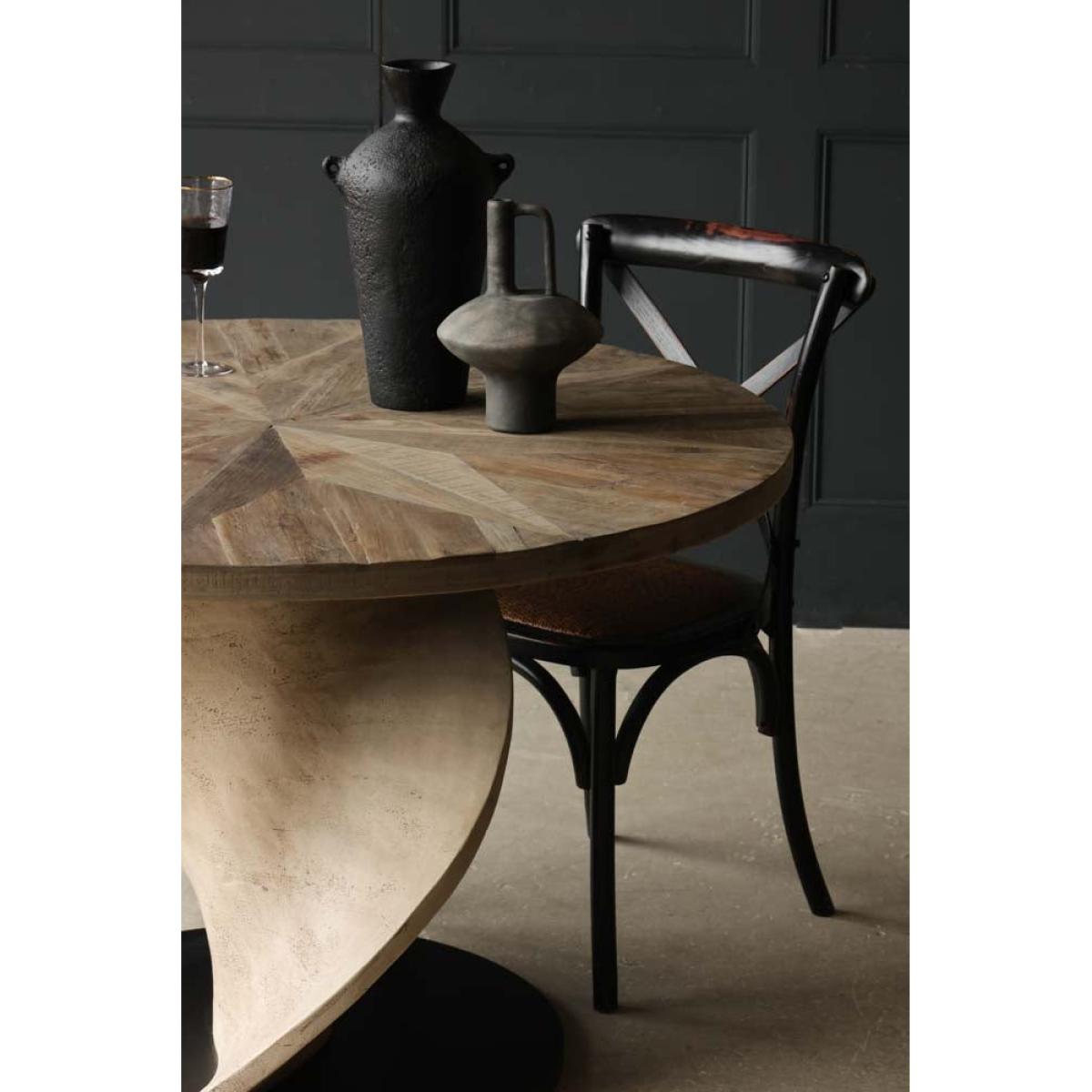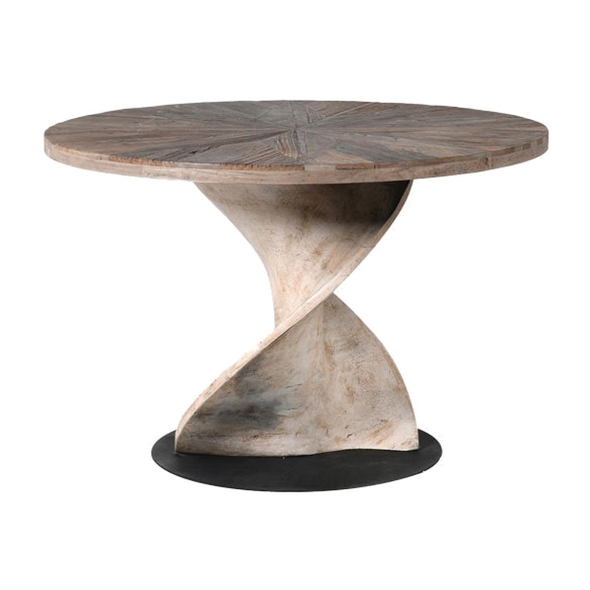 About The Round Elm Twisted Dining Table The Round Elm Twisted Dining Table is a true hero piece for your home. Made with recycled elm, the top of the table features a beautiful star pattern within the wood and is paired with a statement twisted pedestal and black metal base. Measuring 118cm in diameter with a height of 76cm, this statuesque wooden dining table promises to be the stand-out feature of any room. Why We Think You’ll Love The Round Wood Dining Table With Twisted PedestalAs the setting where all the best conversations happen, your dining table is an incredibly important part of the home and deserves to be the centre of attention. Pairing beautiful wood inlay patterns with an eye-catching spiral pedestal, the Round Elm Dining Table is a bold investment piece that is worth every penny. Beautifully crafted with every attention to detail, this is a dining room table that will be treasured in your home for many years to come. How To Style The Recycled Elm & Metal Round Dining TableThe Round Elm Twisted Dining Table looks amazing against dark dramatic walls, light and bright spaces or natural paint palettes; from fresh plaster to terracotta and rich forest green. Style yours with plates of delicious food and large glasses of wine, and sit all your favourite people around the table for fabulous evenings that will live on in your memory.