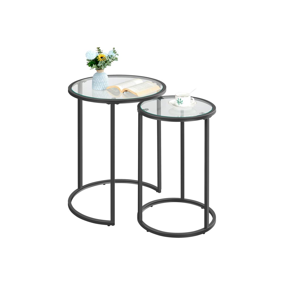 Bring elegance and brightness to your living space with this round nesting end table set. These modern side tables feature a mustard gold matte black finished iron frame with a nesting design that allows you to easily move the smaller end table into the other. The tabletop is built of strong tempered glass, which provides you with a perfect place to display your favorite flower, family frame, and other ornaments. Making cleaning a breeze, the iron frame is finished with powder coating for a longer service time, so you can simply wipe it clean using a clean, dry cloth. Ideal for the living room, bedroom, guestroom, office, apartment, and small space.