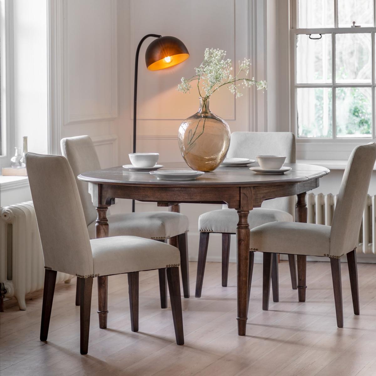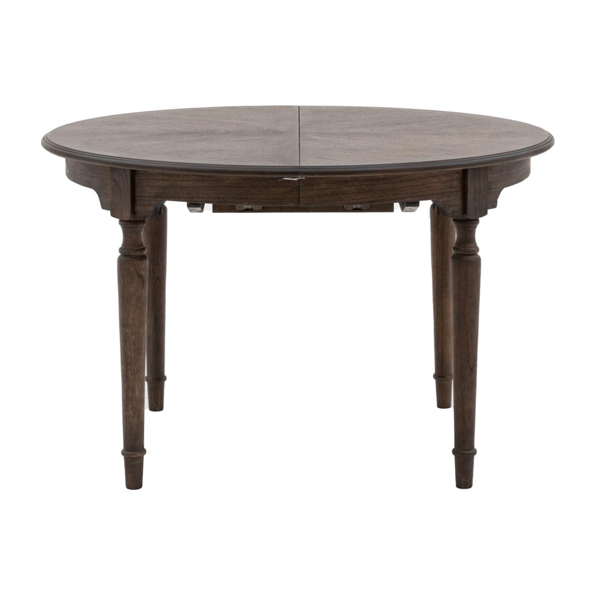 Dimensions:H:75 x W:120/160 x D 120cm Designed to offer a ‘new traditional' look with a timeless elegant style and modern touch, this stunning table will add a sophisticated look to a room. The exquisite dark salvaged coffee coloured Mindy wood solids & veneers are stunningly rich, book matched marquetry detail and turned spindle legs add a elegant final touch. For added practicality the table extends with centre butterfly leaves, so it can seat up to 6 people. Features: Seats up to 6 Butterfly extension Mindi / Mindi Veneer / MDF Assembly required