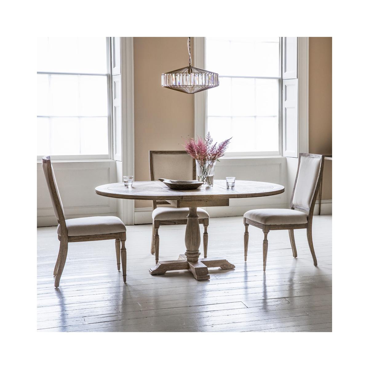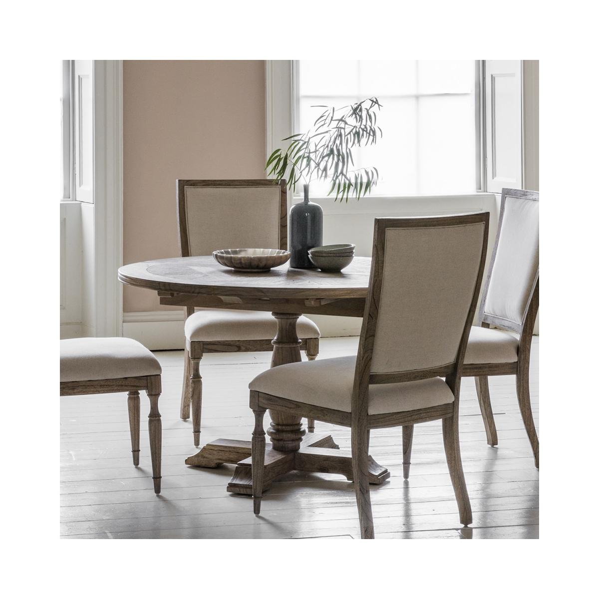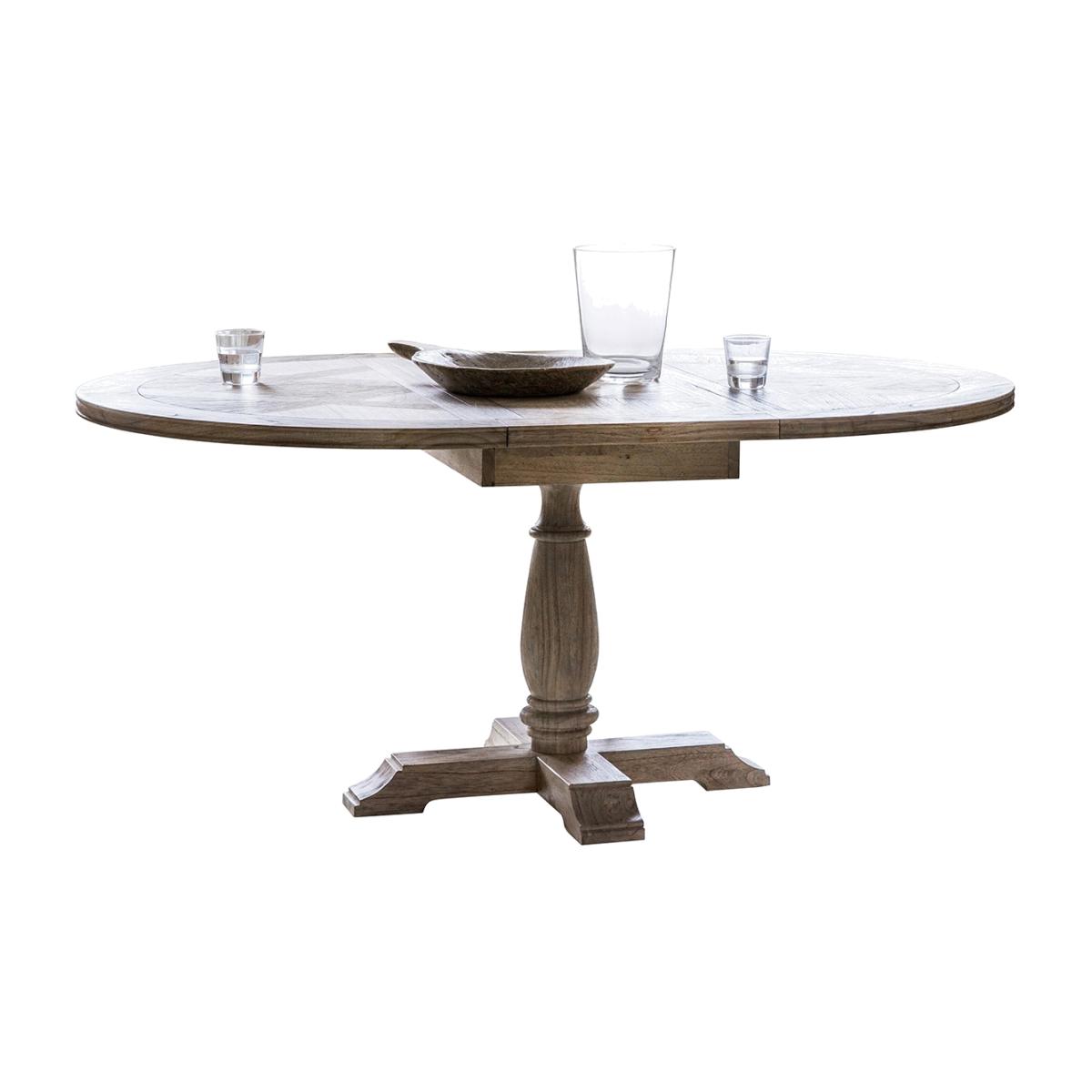 Dimensions:W120-165x H75x D120 cm The Maverick Extending Round Dining Table boasts elegance with a wonderful natural brushed finish. Featuring gorgeous inlaid veneer work with rounded splayed leg and natural markings within the wood, this traditional dining table has strong character. Designed with a fantastic extension system, this dining table is capable of being extended in size, giving you the perfect place to comfortably entertain up to 6 guests while making a beautiful statement. Features: Elegant and traditional dining table Natural brushed finish Gorgeous bold rounded splayedleg Extending table, comfortably sits up to 6 people Complements a variety of home interiors Assembly not required
