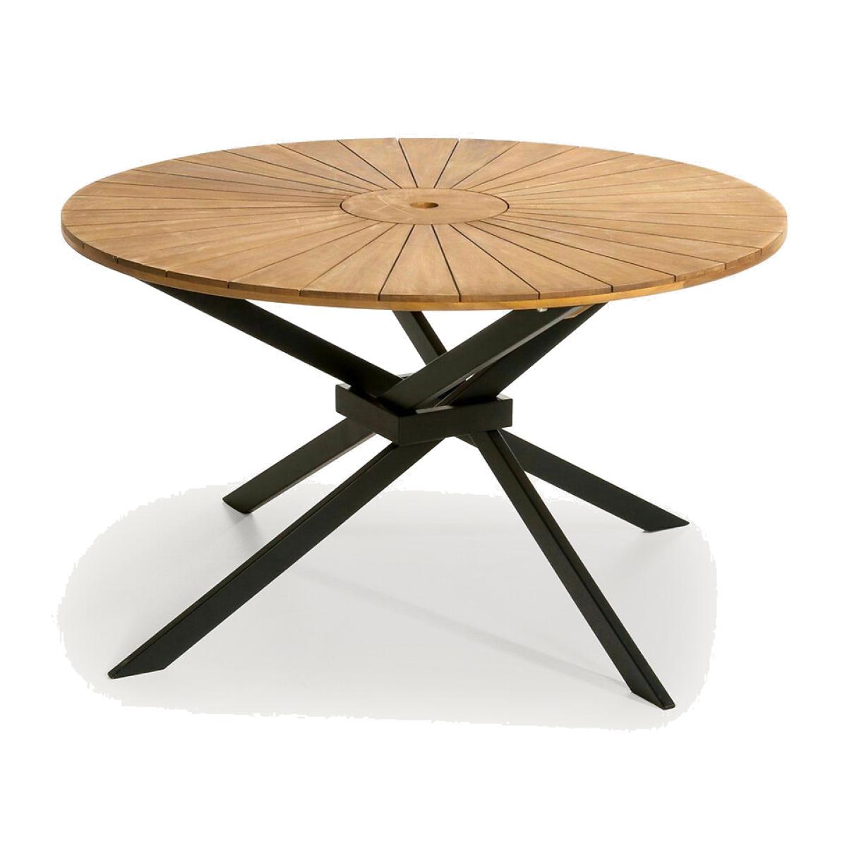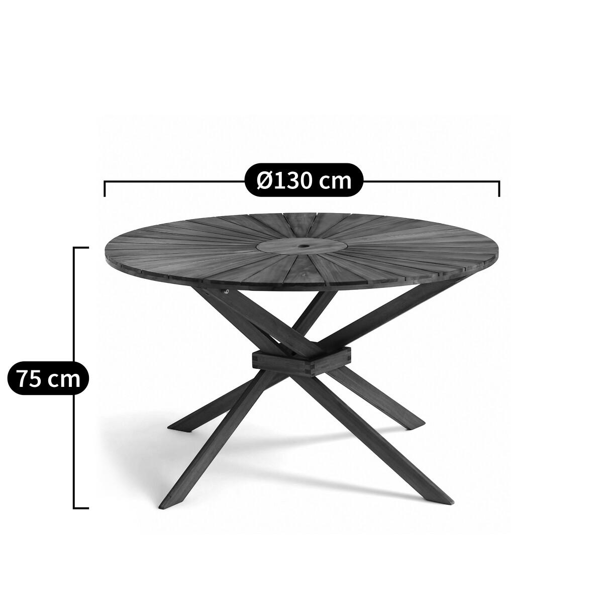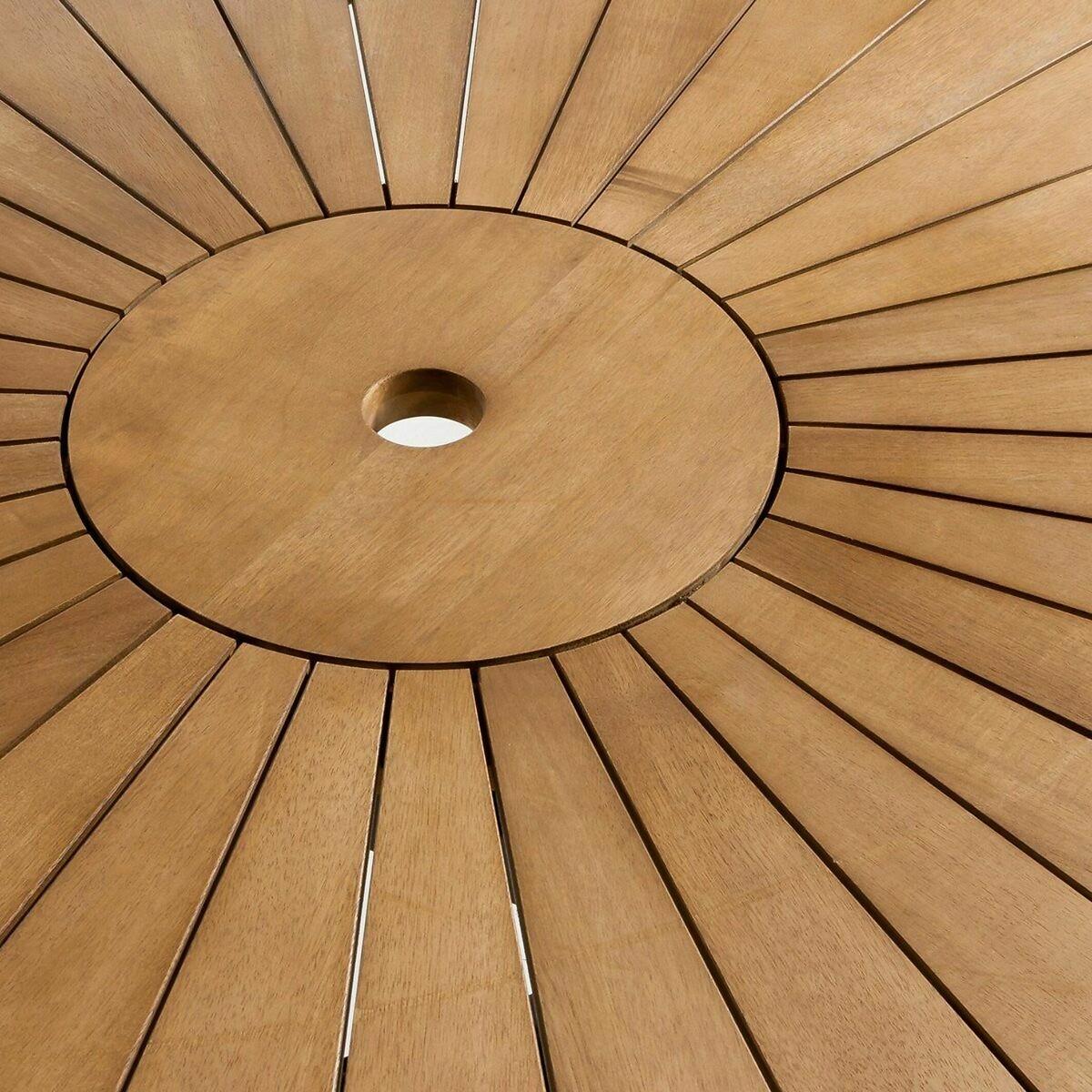 With two versions, the Jakta round table brings sunshine to terraces and gardens in all weathers! Made of acacia, a sturdy wood. Product Details • FSC® certified acacia. • Teak version: teak stained top, matt black legs • two-tone version: tabletop and base in teak-stained wood. Quality Info • Acacia is a wood that offers good mechanical properties (good resistance to insects and fungi) and is resistant to bad weather (alternation of dry and humid periods). Care Advice • To maintain your oiled acacia furniture, if moss appears, simply wash your furniture in clear water mixed with a little bleach-based detergent.. Rinse well and allow to air dry, then sand lightly. If you wish to oil your furniture, avoid the application of several coats which can irregularities in the colour.. Dimensions • Diameter: 130cm • Height: 75cmDelivery:. This product is sold ready to assemble, instructions attached. Available for home delivery. Note! Please check that all access points are large enough to accommodate your delivery (doors, stairs, lifts). • WOOD FROM SUSTAINABLY MANAGED FORESTS. FSC® certified wood comes from forests that are environmentally, socially and economically well managed. Parcel Dimensions • 1 parcel • L134 x H8.5 x D132.5cm. 22kg