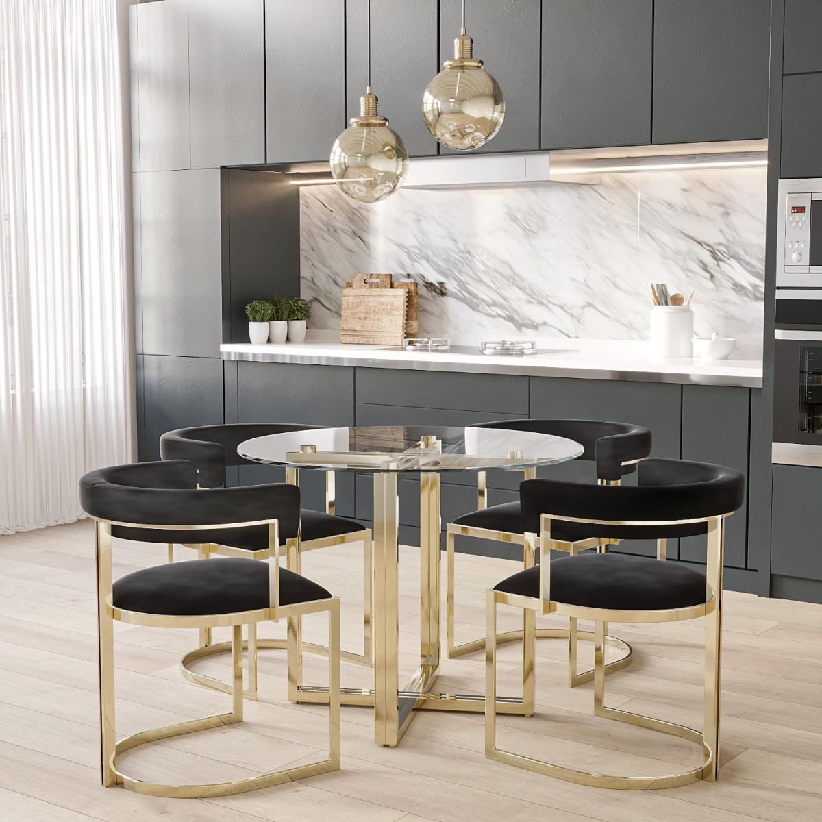 . This bundle includes. 1 x Round Gold Dining Table with Glass Top. 4 x Black Velvet Tub Dining Chairs Features we love Small dining table and chairs with gold metal frames. Comfortably seats up to four people around the table. Comes with 4 black tub chairs with velvet upholstery Table top is made from tempered glass for safety. Cross-frame base allows for extra leg room when dining Need to know. Dining Table Information. Dimensions. W100 x D100 x H76 cm Seats. 4 Shape. Round Colour. Gold and transparent Finish. Tempered glass top and gold chromed legs Material. Glass and stainless-steel For use. Indoors Product weight. 33kg Assembly required. Yes - just the legs Dining Chair Information. Number of chairs. 4 Dimensions. H76 x W58 x D56cm Colour. Black Finish. Velvet upholstery with chrome gold frame Material. Velvet and stainless-steel Assembly required. No.