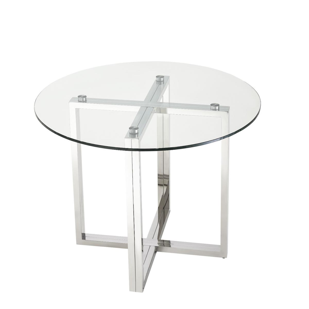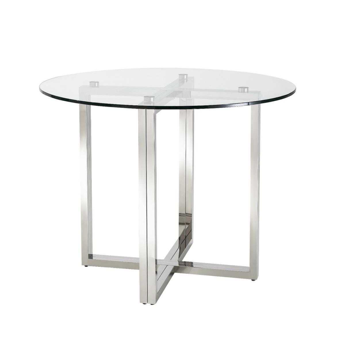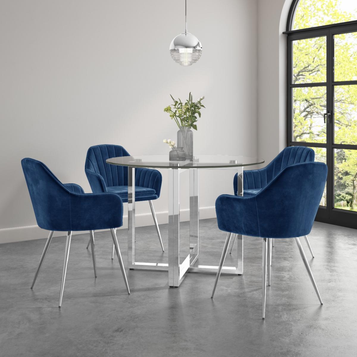 . This bundle includes. 1 x Round Glass Dining Table with Mirrored Legs. 4 x Navy Velvet Dining Chairs – Logan Features we love Small dining set with round tempered glass table top Complete with 4 navy velvet chairs with chrome legs. Seats four people for comfortable communal dining. Chrome cross-frame base allows for ample leg room. All chairs are foam-filled for comfort and support. Channel-tufted tub chair back for style and comfort Need to know. Dining Table Information. Dimensions. W100 x D100 x H76 cm Seats. 4 Shape. Round Colour. Silver and transparent Finish. Tempered glass top and silver chromed legs Material. Glass and stainless-steel For use. Indoors Product weight. 33kg Assembly required. Yes - just the legs Dining Chair Information. Number of chairs. 4 Dimensions. H85 x W59 x D45cm Colour. Navy Finish. Velvet upholstery Material. Velvet and metal Assembly required. Yes.