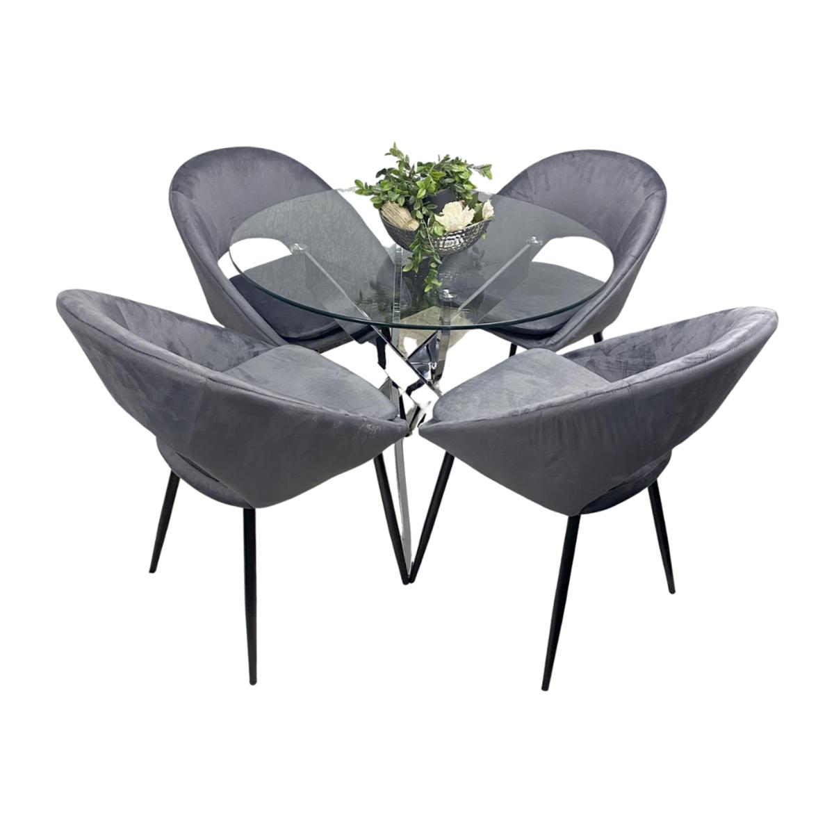 This elegant dining set features a clear glass round table paired with four grey velvet chairs, adding a touch of sophistication to any dining area. The tempered glass top offers a sleek, modern finish, while the chic chrome legs provide stability and style. The plush grey velvet chairs combine comfort with luxury, making this set perfect for everyday dining or special occasions. Features Clear tempered glass round tabletop for a modern and elegant appearance Chic chrome legs for a stylish and contemporary look. Four grey velvet chairs offering comfort and a luxurious feel. Rubber-capped legs on table and chairs to protect floors from scratches. Easy to assemble with all parts and clear instructions includedDimensions. Table 90 cm (L) x 90 cm (W) x 75 cm (H)Chair 87 cm (H) x 59 cm (L) x 44 cm (W)Seat height 45 cm
