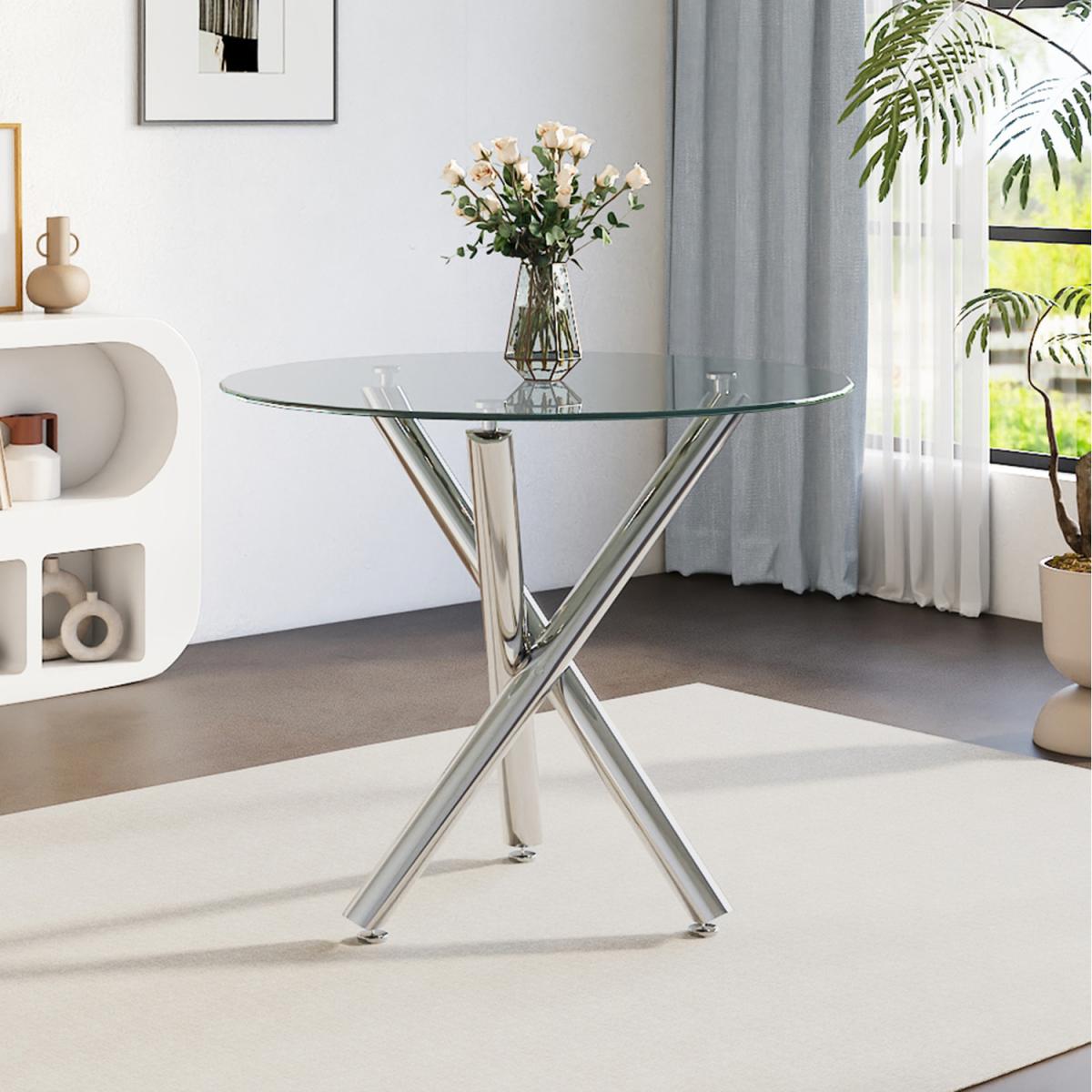 This versatile glass table can function as a dining table, side table, or coffee table, making it suitable for a variety of settings. It also serves as a decorative piece for placing items in lounges or other spaces. Its minimalist cross-base design allows light to pass through the transparent tempered glass top, highlighting the electroplated chrome base's metallic sheen. The anti-skid pad at the bottom ensures stability and minimizes floor friction. Sturdy and durable, this glass table's simple yet elegant design enhances any space, making it a practical and stylish addition to your home.