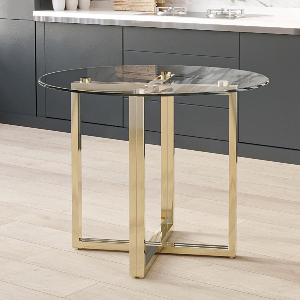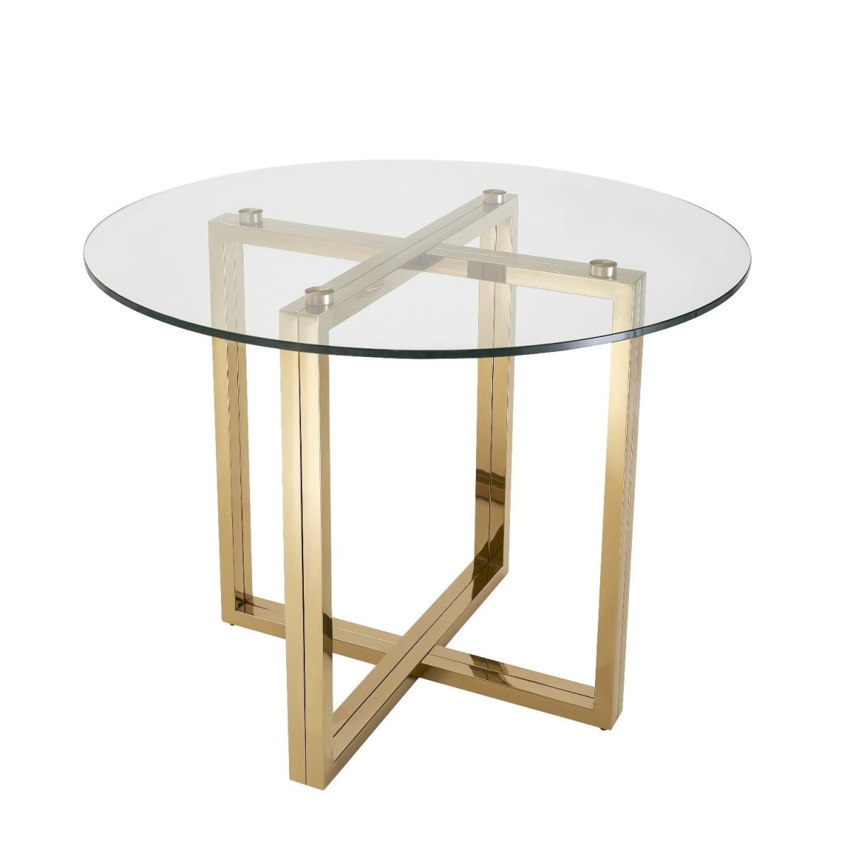 Features we love Modern glass dining table ideal for any dining space. Gleaming gold polished cross steel legs. Clear round tempered glass tabletop. Comfortably seats up to four people around the table Pair with any of our dining chairs to complete the look All about me. Make entertaining for guests a stylish affair with this elegant dining table. Its understated yet chic design means you can also mix and match with any of our dining chairs to complete the look you desire. There’s little assembly too with only the base to attach. Need to know. Dimensions. W100 x D100 x H76 cm Seats. 4 Shape. Round Colour. Gold and transparent Finish. Tempered glass top and gold chromed (legs) Material. Glass and stainless-steel For use. Indoors Product weight. 33kg Assembly required. Yes attach the legset.