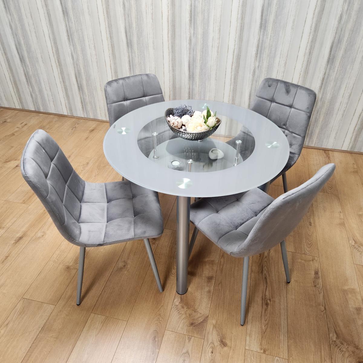 A great combination of top-quality tempered glass and rust-resistant. In the case of spills, the water-resistant, glass table top allows for the easiest cleanup possible simply wipe them up in just seconds. Modern and compact, with a shelf storage glass surface and 4 tufted grey velvet chairs. Perfect as a breakfast table or as an option for smaller spaces, this practical piece is good-looking and versatile. The sturdy frame offers increased support stability and rigidity. A slightly curved shape is more comfortable to sit on, and with lots of padding. Armless design to give a chic look and bring modern elegance to your home dining room. Glass Dining Table Round:90 x 90 x 75 cm(L x W x H). Chair Dimension: 44(W) x 59(D) x 87(H)cm