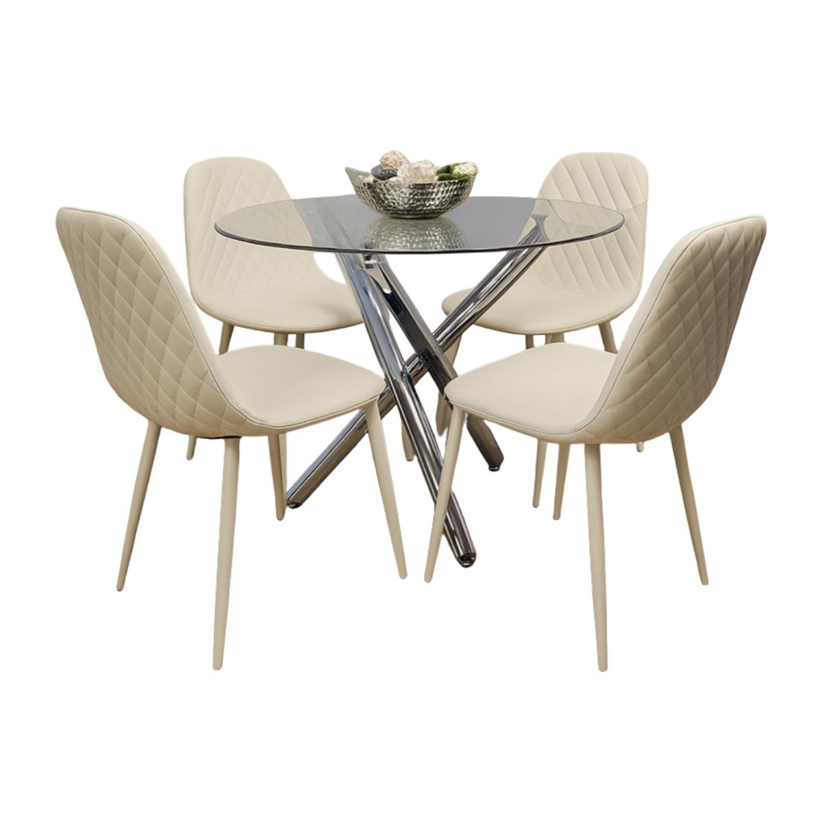This round clear glass dining table set is designed to bring a modern and elegant look to your dining space. The table features a clear glass top supported by chrome metal legs for a stylish finish, paired with four cream leather plastic chairs that offer both comfort and practicality. A perfect choice for kitchens, apartments, or contemporary dining rooms. Features: Round clear glass dining table with chrome metal legs Includes four cream leather plastic chairs Modern and stylish design for everyday dining Comfortable and easy-to-clean seating Compact and practical dining set for family use Dimensions: Table: H75 cm x L90 cm x W90 cm Chairs: H83 cm x L57 cm x W49 cm