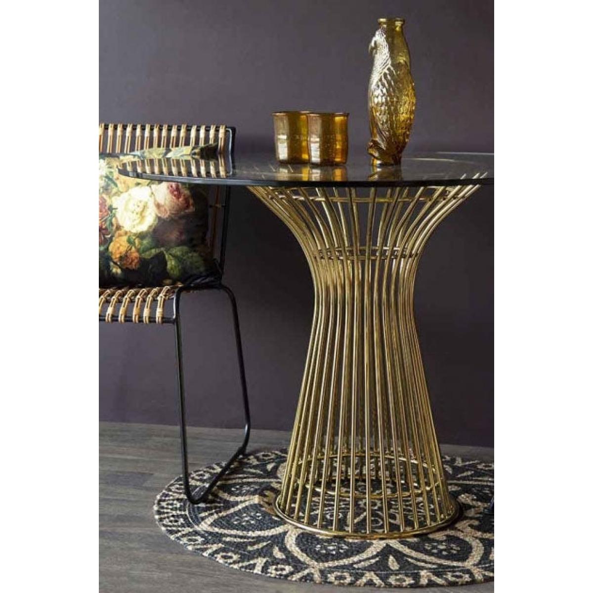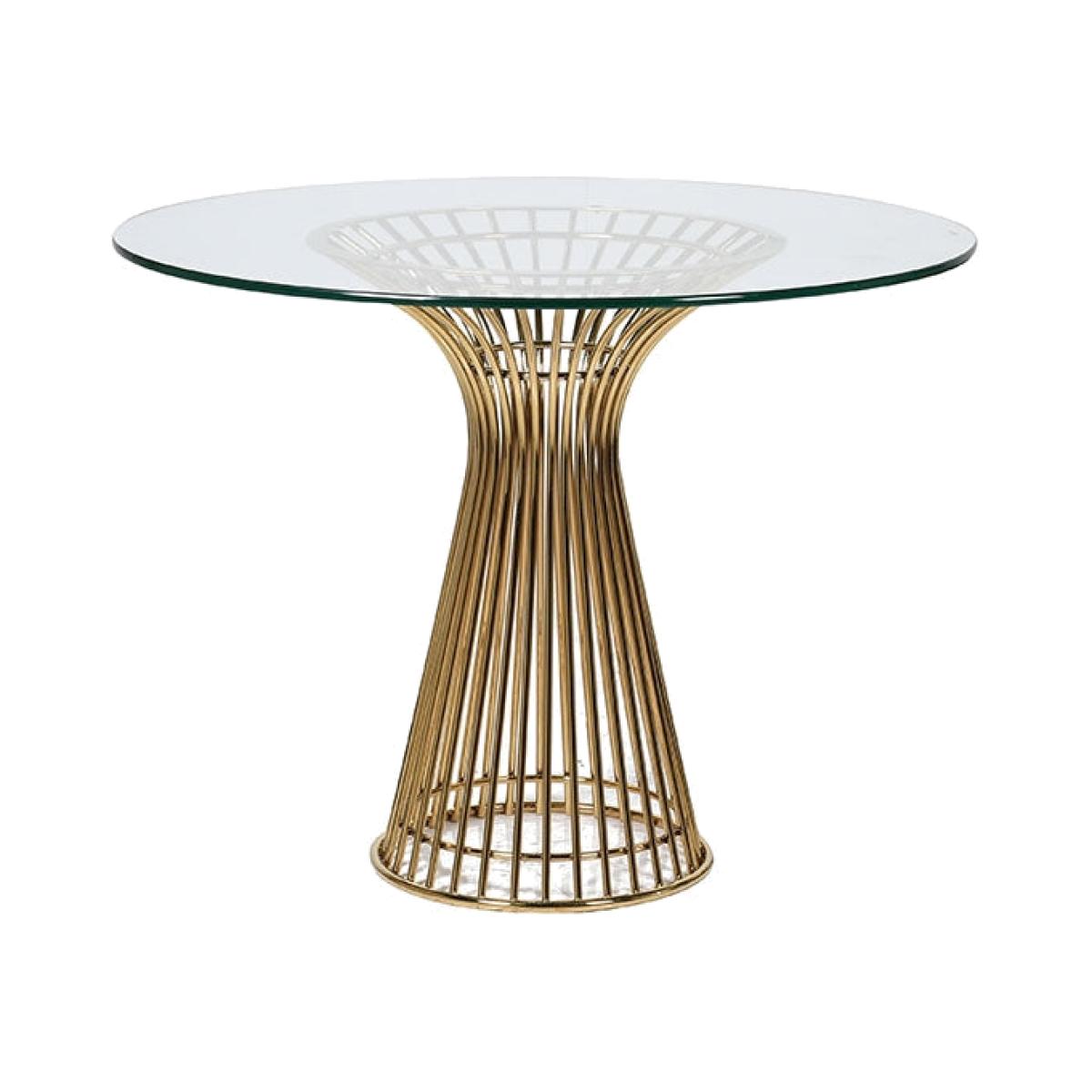 About The Round Glass Dining TableElegant, poised and oh so sophisticated the Round Glass Dining Table will bring that je ne sais quoi to your home interiors!A contemporary piece of dining furniture, the circular table features a gold fluted base and a large clear glass top. Perfect for modern décor or small space living the Round Glass Top Dining Table has a stainless steel frame and measures 100cm in diameter x 60cm in height. Please note, this beautiful table is handmade so it may have the small imperfections or variations which only adds to the authenticity of this beautiful table. This dining table will require a private courier delivery, with delivery made within 4 weeks of your order being placed. Why We Think You Will Love The Round Glass Top Dining TableA lovely piece the Round Glass Top Dining Table will complement any interior that is in need of a modern update, but we think that it will be particularly loved by anyone who lives in a small flat or home, or simply needs to furnish a small dining room. This is because the Round Glass Top Dining Table is raised on a gold stainless steel stand and has a glass top, meaning you can see more of the floor and thus creating the illusion of more space in a room!How To Style Your Round Glass Top Dining TableSitting two to four people the very sophisticated the Round Glass Top Dining Table would look fabulous with some contemporary style dining chairs such as our Gala Velvet Dining Chairs or the Faux Leather Dining Chairs With Brass Legs. Then create a lovely centrepiece with a large vase of florals or a quirky candlestick display. If you really need to save on space consider suspending a floral centrepiece above the table. Its incredibly impactful and is guaranteed to make heads turn and jaws drop.