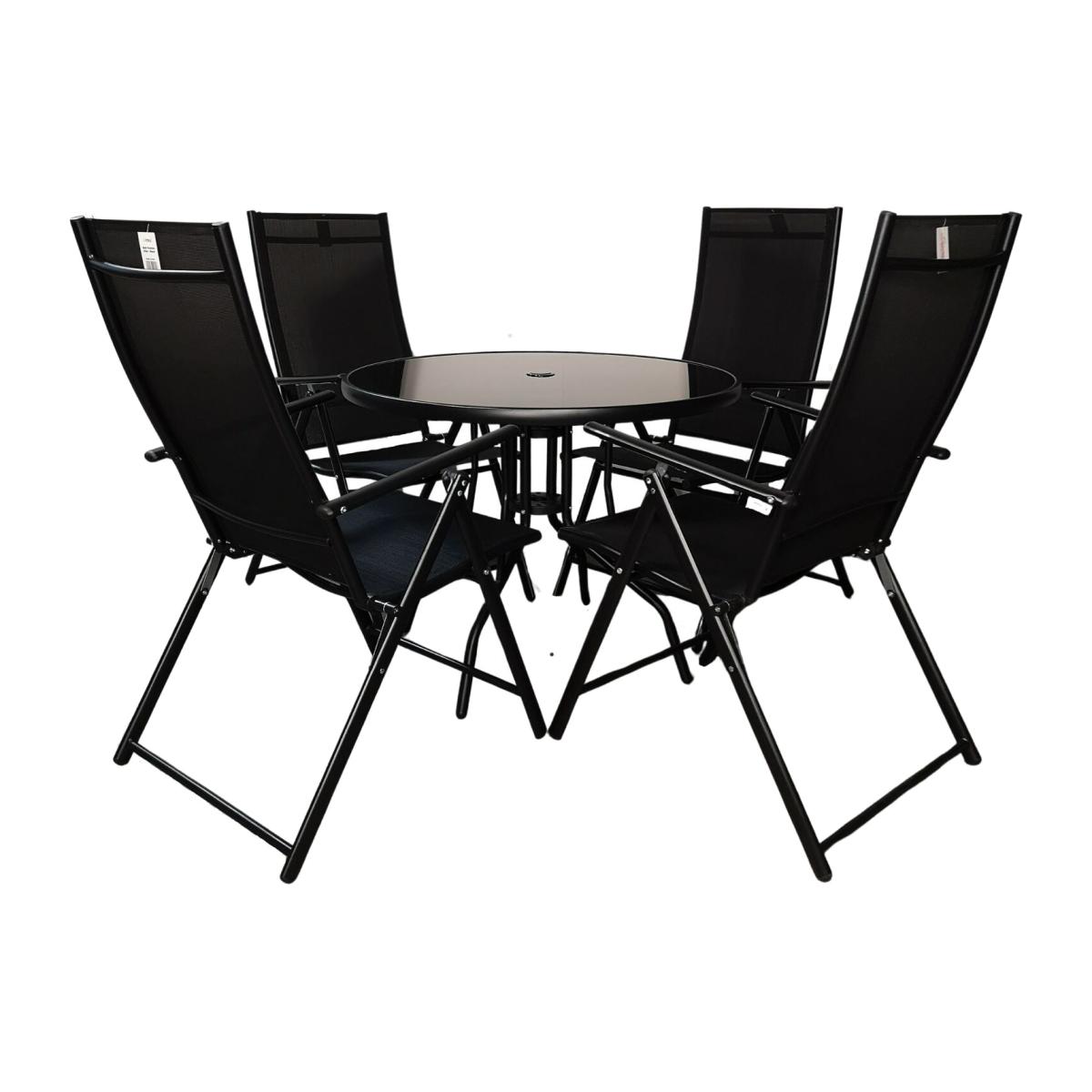 Relax and enjoy your leisure time this summer with this attractive glass top outdoor dining table and 4 chairs set. This stunning set will become the focal point to your garden, terrace or patio area making it ideal for dining on or just enjoying drinks in the summer sun and has space for up to 4 seats. Having an outdoor patio furniture set can greatly enhance your outdoor living space and creates a comfortable and inviting space for you to relax, entertain, and enjoy nature. The set includes a black, round tempered glass top table with 4 multi-position chairs. Having a black steel set will blend seamlessly with its surroundings. It adds sophistication and a sleek, modern touch to your patio or garden. The frame of the table and chairs are made from steel and have been finished with a powder coating for added strength and durability. The chairs have a textilene backing and they can easily be folded away when not in use for easy and convenient storage. Choose from various positions to recline by adjusting the seat handles to sit back and unwind. The set is supplied flat packed and self assembly is required.
