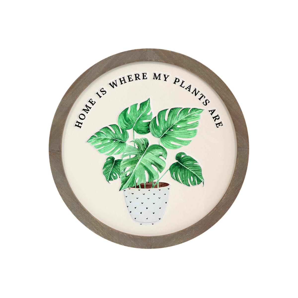 The Round Houseplant Embossed Sign is a stylish addition to your walls. The plaque is available in two designs, and each features a beautiful, realistic, highly detailed plant design and reads either 'home is where my plants are' or 'there's no place like home.' The plaque is finished with a natural wood-effect frame and is quick and easy to hang via hooks on the back.