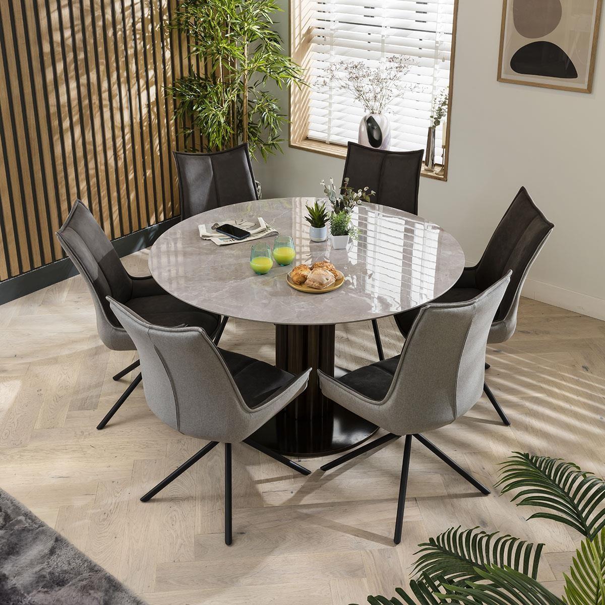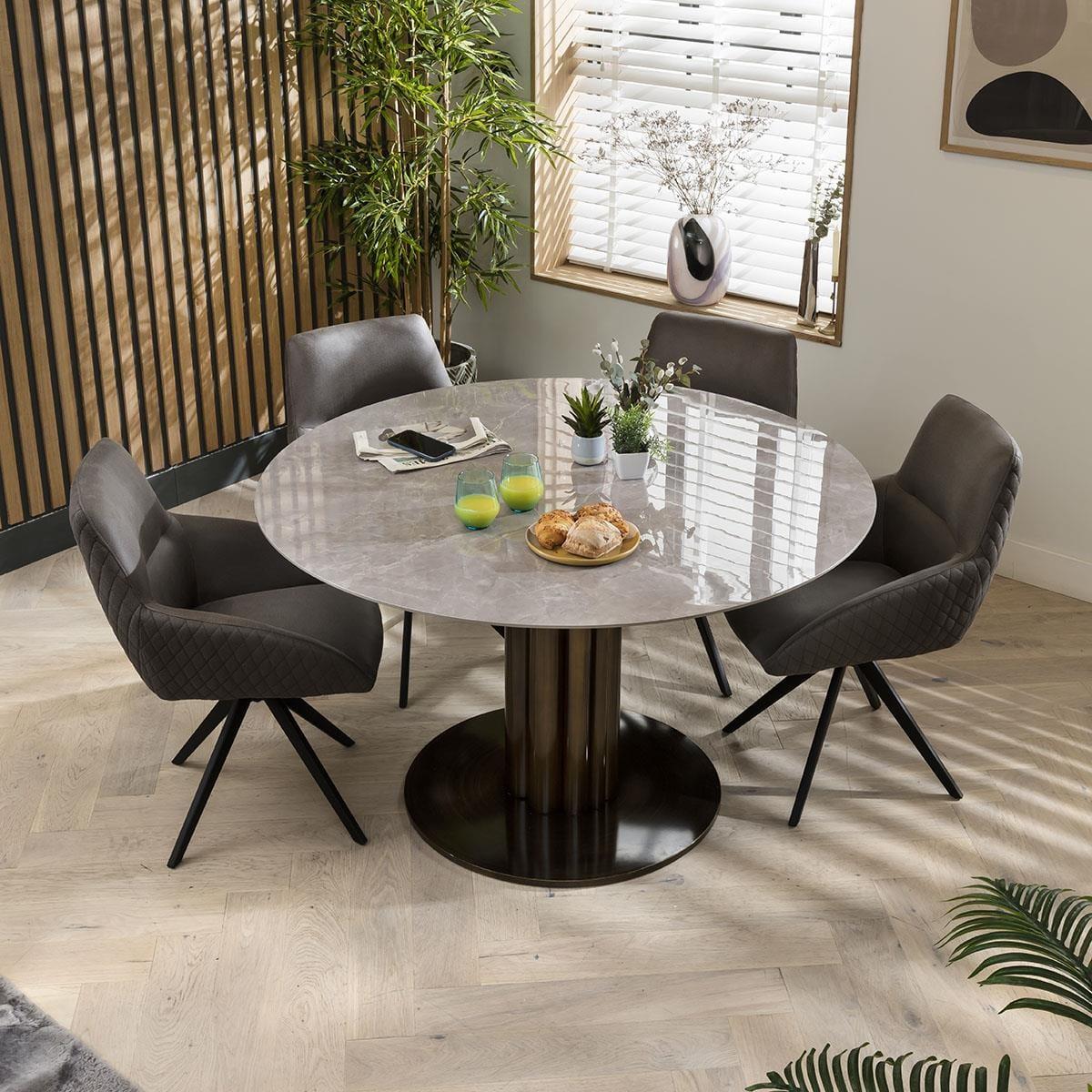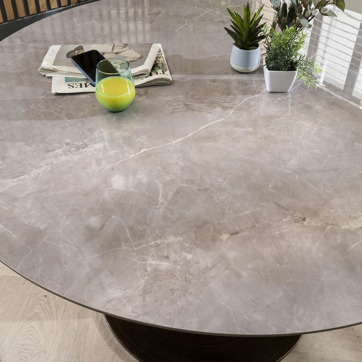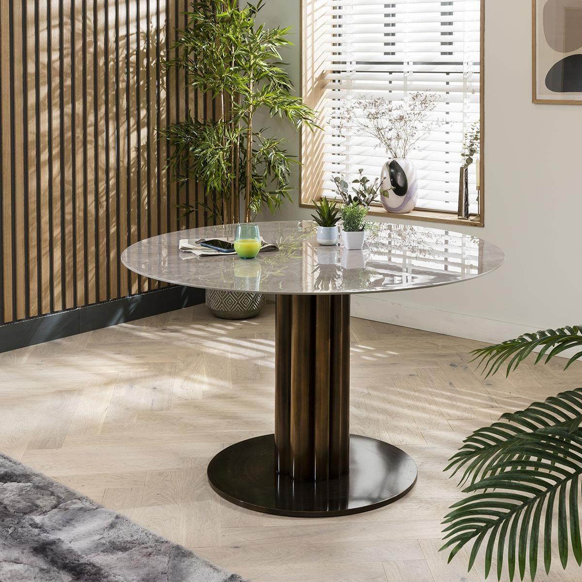 Exclusive to Quatropi. The Luxury Round Dining Table from the Rugano Collection is the result of the perfect combination of quality materials: wood, marble and metal united by an elaborate and original design. The 135cm top is crafted from premium polished marble with golden, deep black and rich cream tones. The base is metallic gold and is decidedly important and scenographic. T The Modern Round Dining Table is ideal in the dining room or kitchen, be it in a modern and contemporary or classic style, where it can be as beautiful as it is solid, practical and functional, with a remarkable visual impact and therefore suitable for embellishing any environment with a touch of class and refinement. Choose it if you want a home that stands out, but gracefully, with furniture that perfectly combines functionality and aesthetics, and if for you, the furniture is the hallmark of a welcoming and well-kept home. W135cm D135cm H75cm 5 Seater Designer Marble Dining Table High Quality Metal Pedestal Base