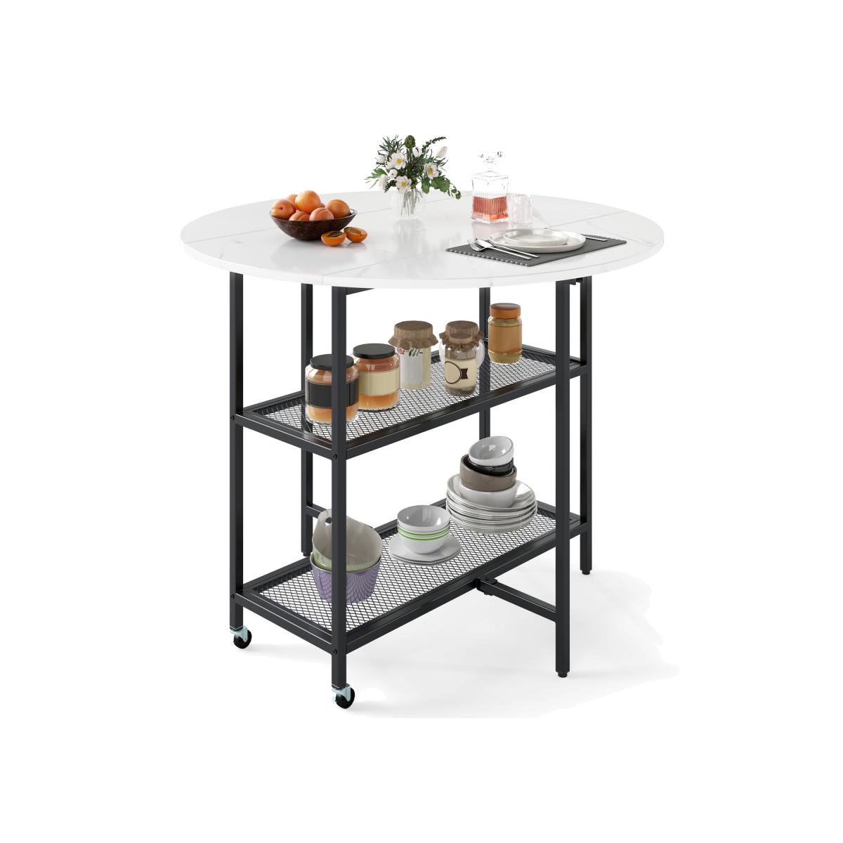Take a look at our elegant and versatile dining table! This multi-functional folding dining table boasts a 100 cm wide round tabletop with a marble-textured design for elegance. It can serve as a dining area for family gatherings, a workspace, or a display platform. With 2-tier mesh shelves and a middle storage rack, this round kitchen table conveniently stores kitchen supplies, tableware, or office supplies. The 2 lockable wheels make moving and positioning effortless, while the drop-leaf design allows it to be folded and stored against a wall.