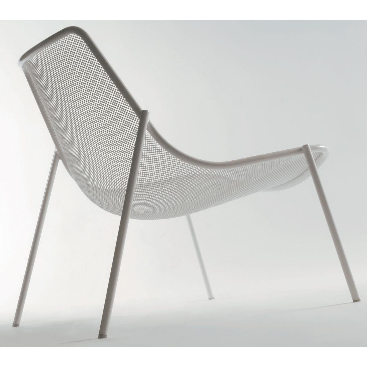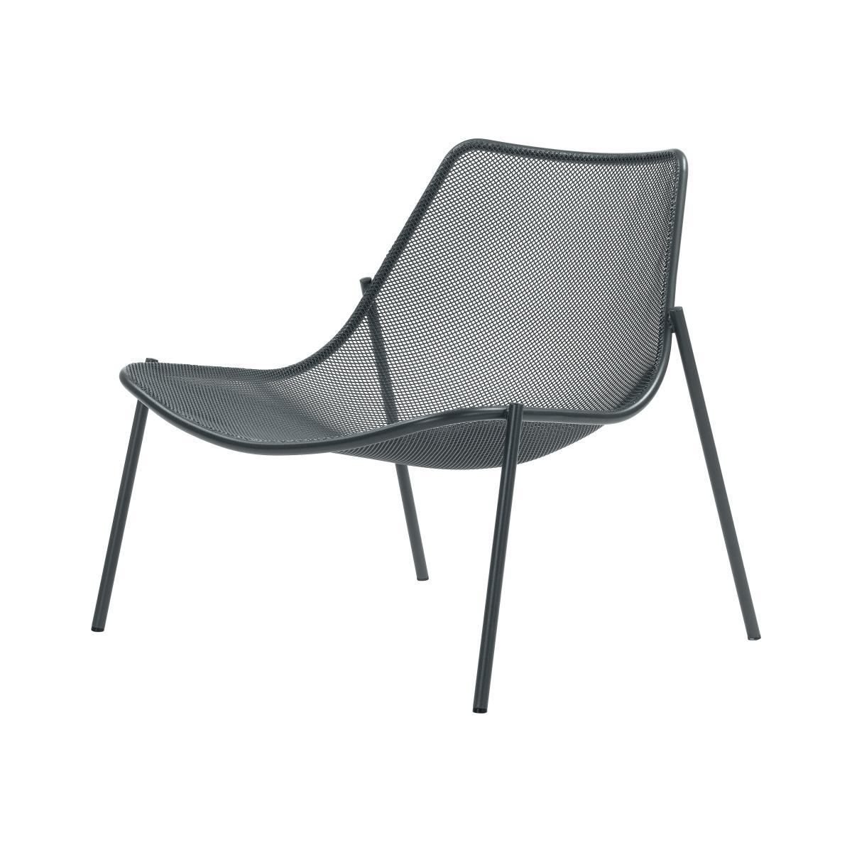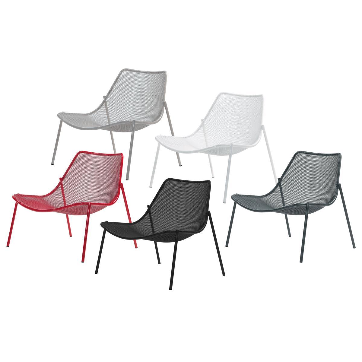 This "lounge" Round Low armchair by Christophe Pillet displays round lines and airy design. It is a real technological feat: this collection transforms steel – rigid and cold – into "plastic", soft and extensible material. Thanks to an innovative process, the shell of the Round chair is made of a stretched metal sheet that is moulded and shaped in one movement. Its enveloping forms, backrest and large seat (92 cm) guarantee optimal comfort. The metallic intertwining creates volume and an impression of incorporeality. A balanced design and a discrete elegance. This piece will fit to any home, garden or public area (cafés, restaurants,. ). Round chair is available in five colour shades: white, antic iron, black, grey, red.
