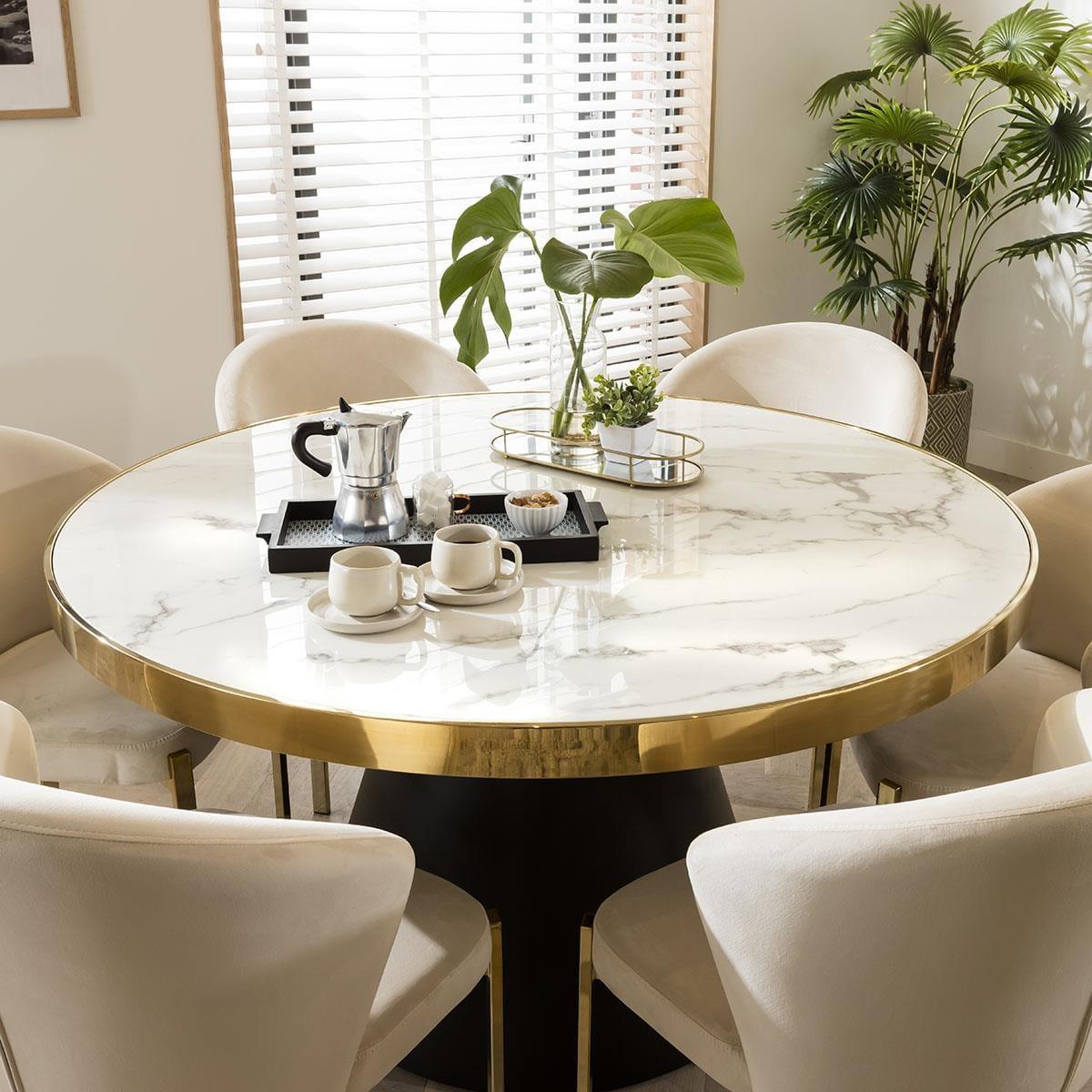The Vector dining table is a testament to pure, timeless architectural form. A 140cm diameter round shiny gold framed faux marble surface securely fashioned to a rich black stainless steel base creates a striking juxtaposition in bold colour with an overall height of 75cm. Revitalise your dining room decor with the JLA Luxury Cream Velvet Upholstered Dining Chairs. Graceful, minimalist lines draw inspiration from the signature silhouettes of mid-century dining chairs that blend seamlessly with the luxe comfort of the JLA Collection's soft and stain-resistant performance velvet upholstery. Cleverly proportioned, its curved back is designed to cocoon around you. If you need more information about this product, use the Live Chat service to speak to the team or send us a message. Spread the cost our with interest-free finance options. Minimum spend applies. W140cm D140cm H75cm Features modern velvet dining chairs Set includes the Vector dining table and 6 JLA chairs