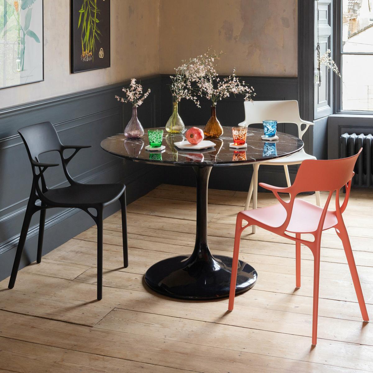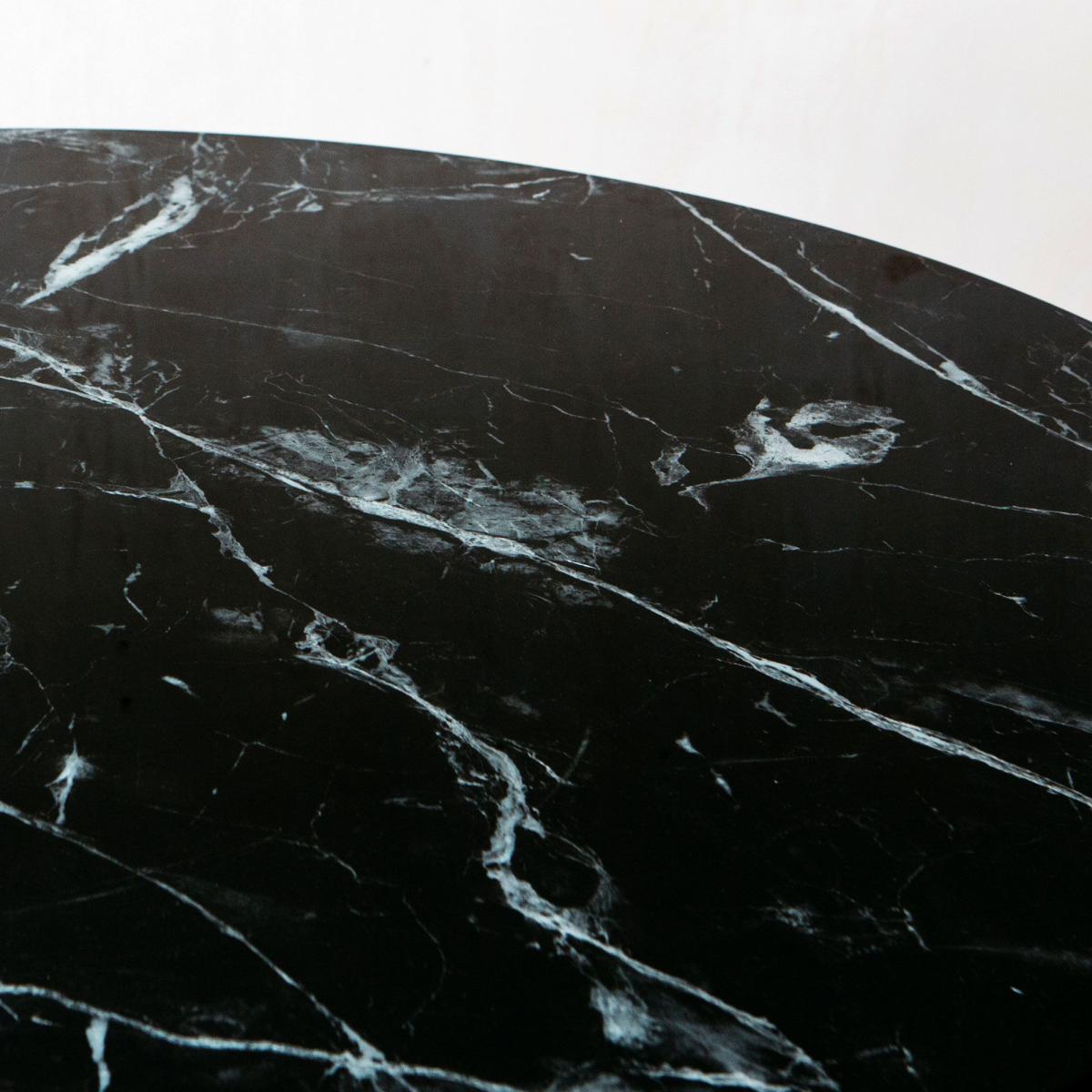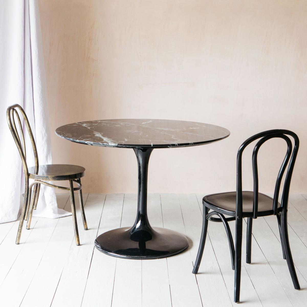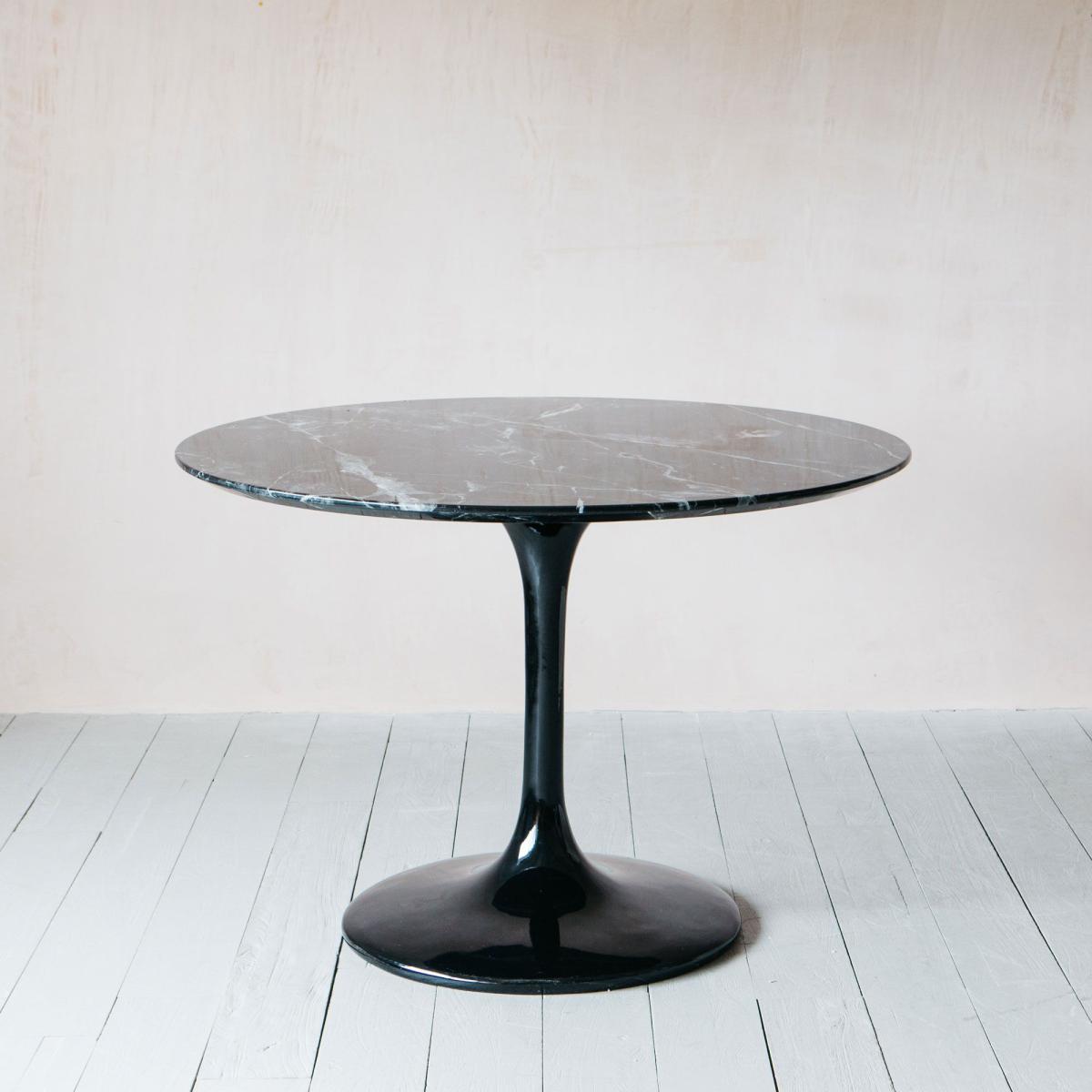 A timeless round dining table with a classic tulip design, crafted from fibreglass and polyresin with a luxe marble-effect tabletop.