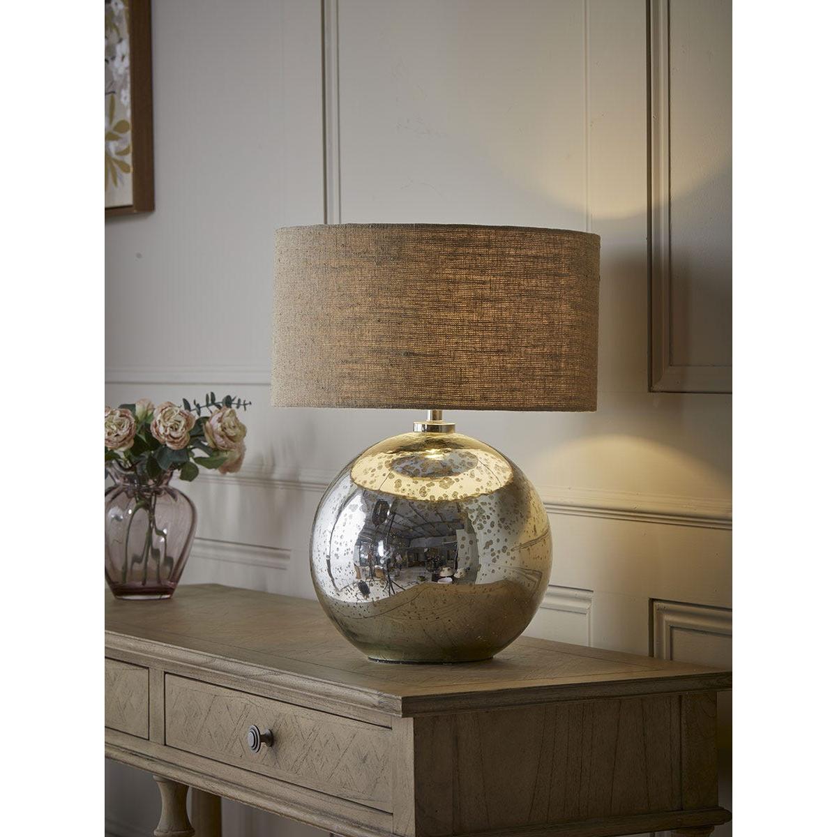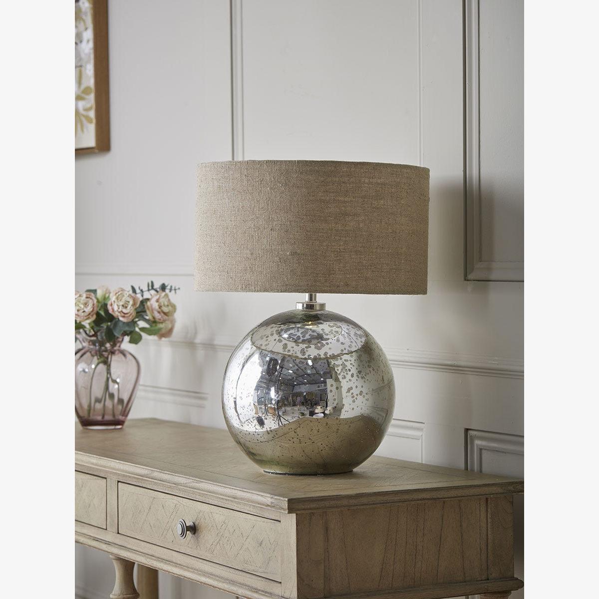 In a striking silver, our Mercuried Glass Table Lamp adds an elegant shine to your space. Its bright base allows the light from the bulb to reflect, creating a warming glow around your space. Paired with a neutral toned lampshade, this lamp sits beautifully in a variety of interior schemes, and creates sophistication wherever it is placed.  Discover how to create the perfect lighting scheme for your home using our Lighting Buying Guide.