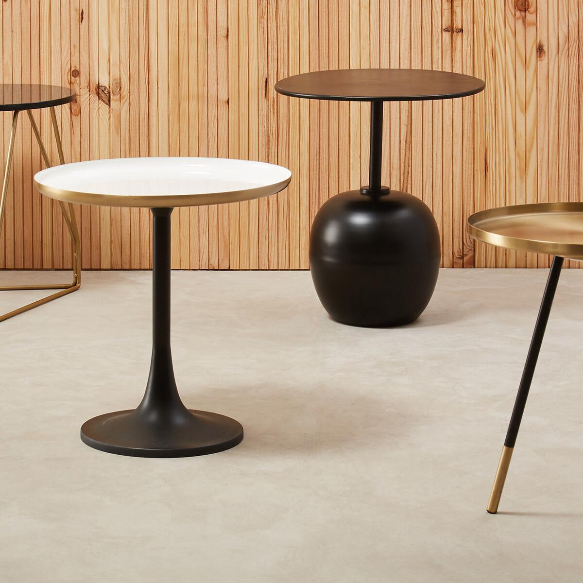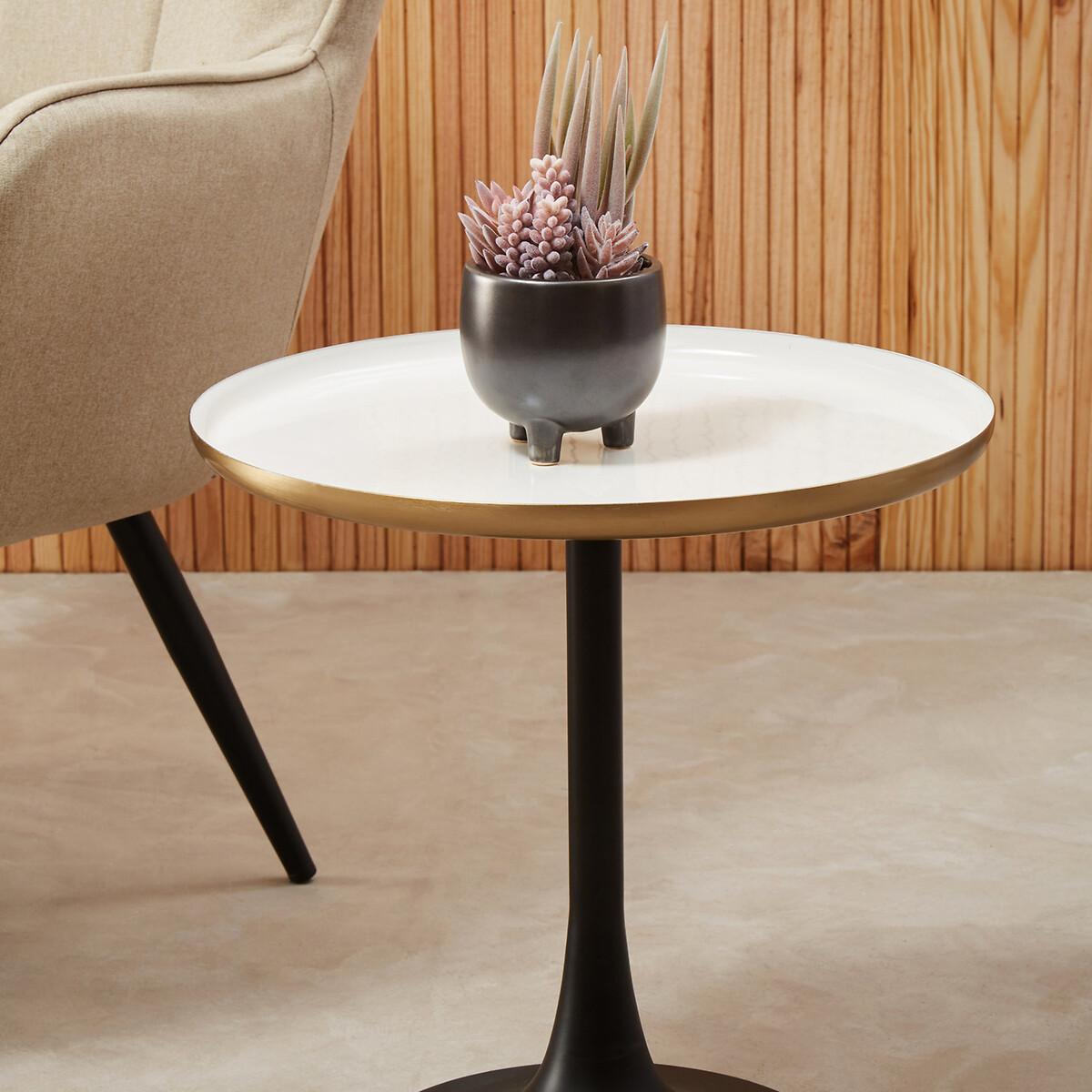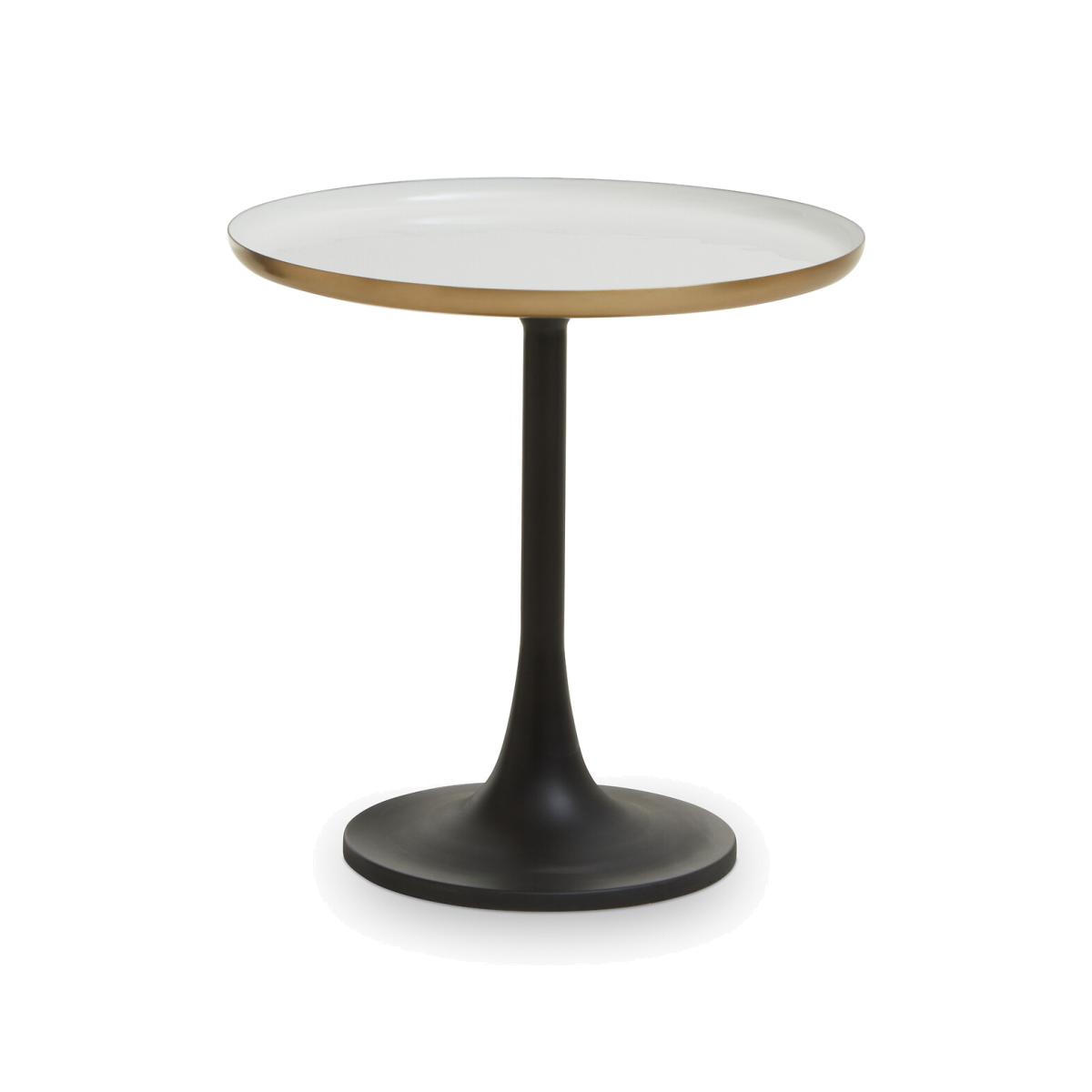 Update modern living rooms with this side table featuring an elegant column base in black powder coating. A round top in white enamel finish rests atop the classic frame, with a gently elevated base in matte gold finish that elevates the glam appeal. Simple and elegant, this mid-century inspired table with a sleek black powder coated base will suit small spaces. Product details Black powder coated base White enamel top. Matte gold finish tabletop underside Assembly required Care instructions Wipe clean with a soft cloth. Do not use abrasive cleaners. Product Composition - Glass, Metal. Product Dimensions - 47 cm x 46 cm x 46 cm , Weight - 4.4 kg. Package Dimensions - 53 cm x 53 cm x 52 cm, Weight 7 kg. This product will be dispatched by one of our trusted suppliers. You’ll be contacted by their selected courier about your delivery. PREMI01