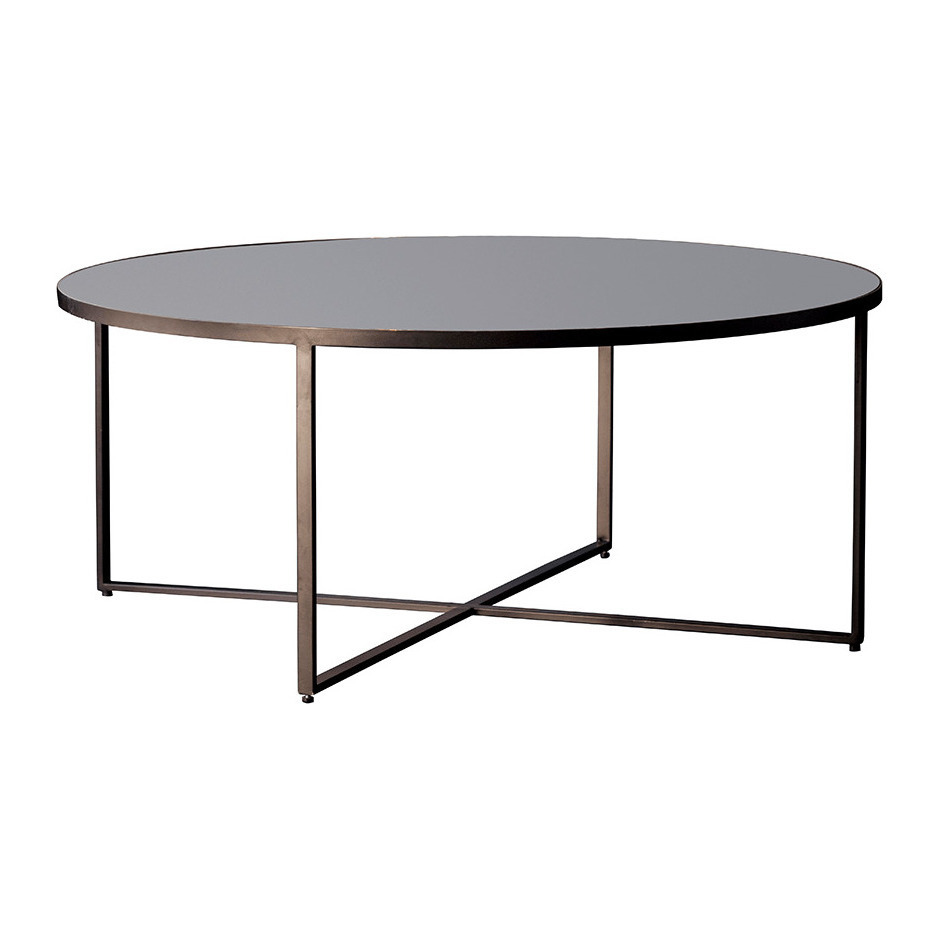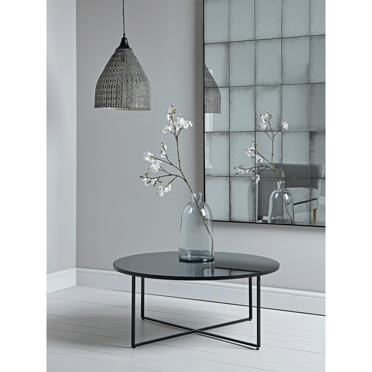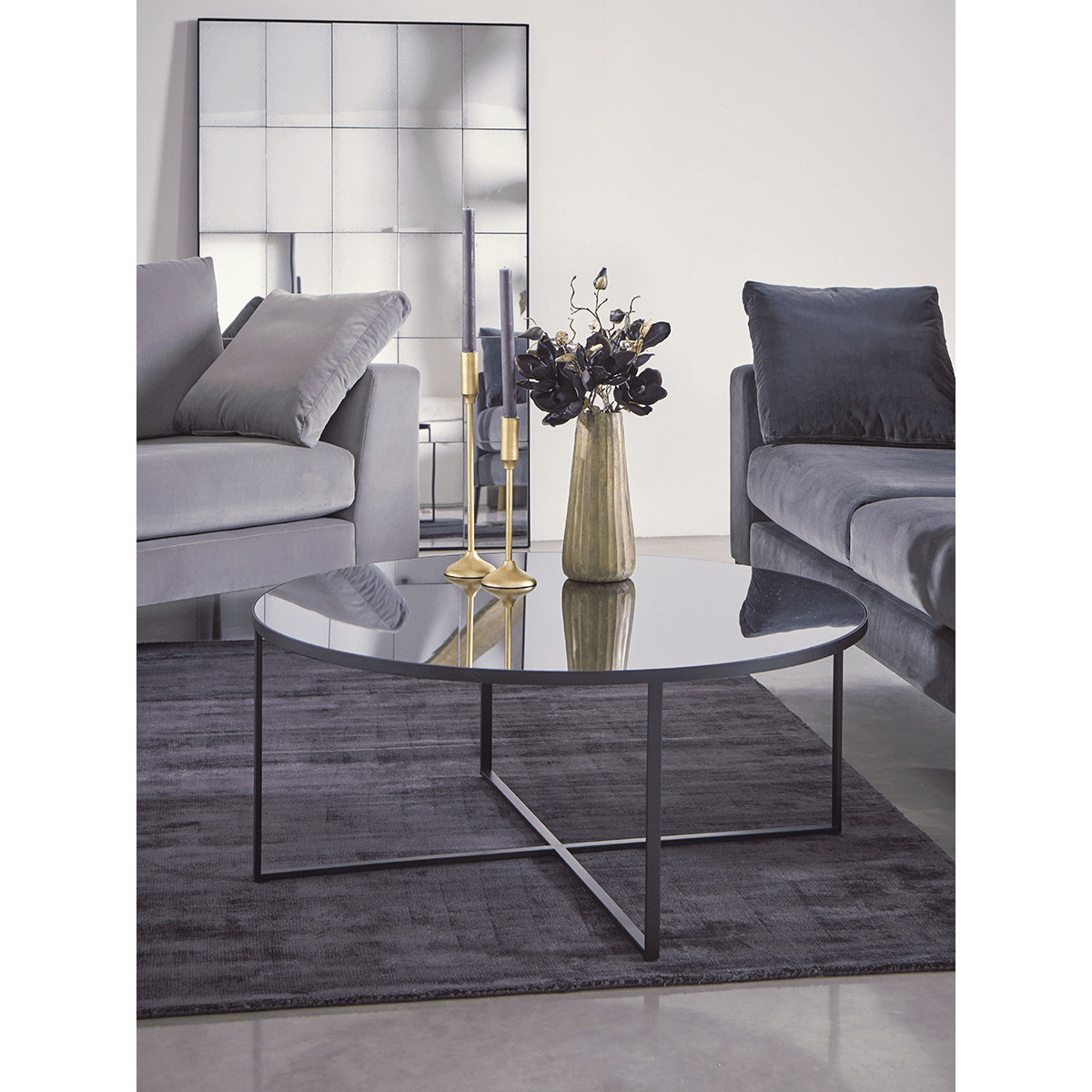 The perfect contemporary centrepiece for any living space, our fabulous round coffee table features a mirrored top in smokey grey, with a modern, cross legged frame in black. A beautiful way to reflect the light in your home, the mirrored surface will add a unique touch to your decor. Style with our Aged Glass Panel Mirror and Distressed Maroq Pendant to recreate our look.