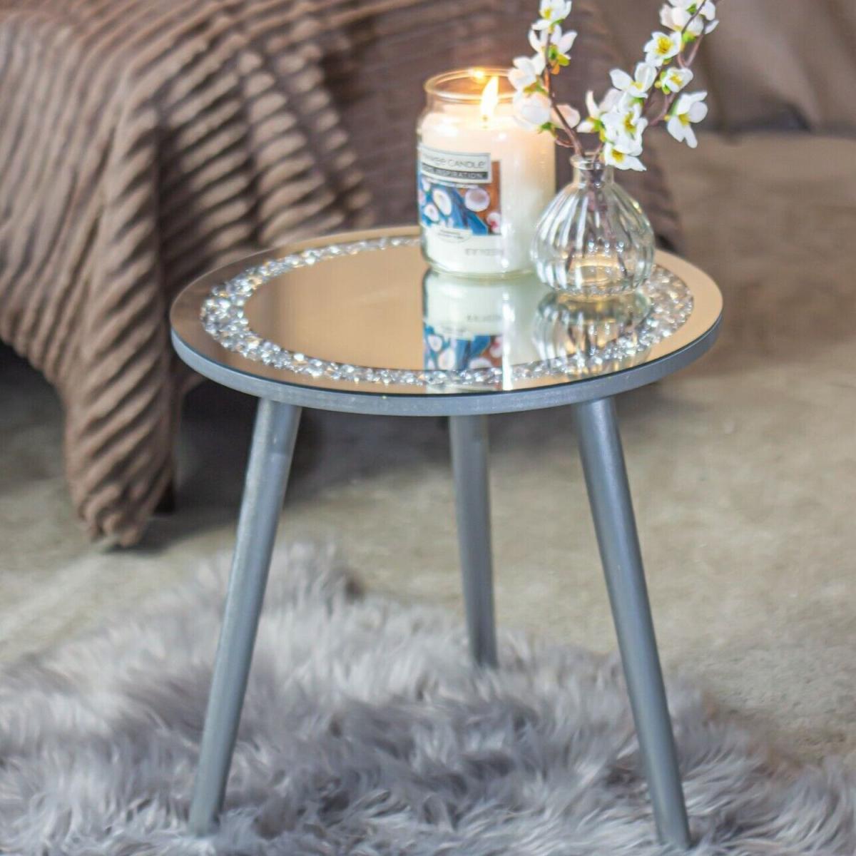 Enrich your living room with the extravagant and glam style of this Mirrored Crystal Side Table! Stylish, sleek and practical, these modern crushed crystal mirrored tables are striking in any room. Functional as well as eye-catching, they offer an ideal surface to rest drinks, remotes, and other items, as well as bringing much needed sparkle and shine to any corner of your room. With sturdy legs crafted from MDF wood coated in silver grey and a stunning mirrored glass top decorated with a glamorous crystal border, these tables are made to high quality and will stand the test of time and up to repeated use time and again! Finished with intricate detailing and with a stunning mirror effect finished with crystal border, this table is one you'll want to offer pride of place in any home.