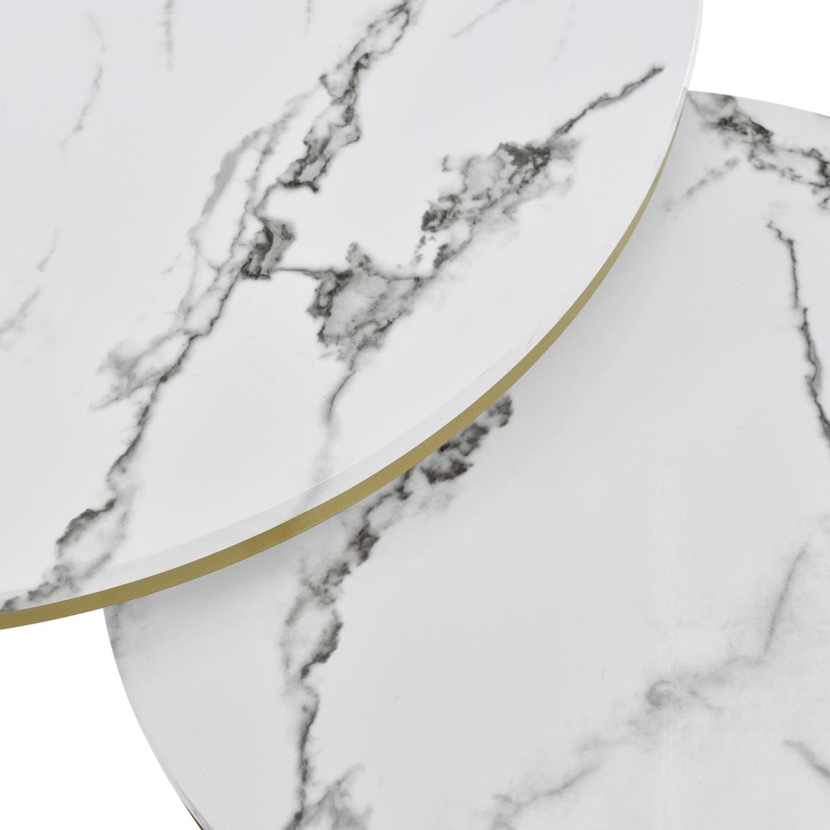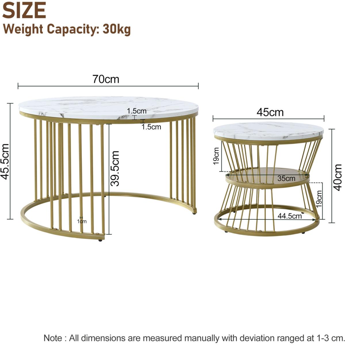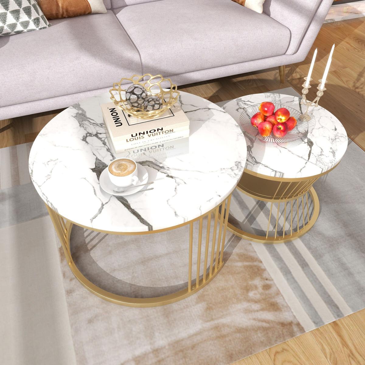 The coffee table set includes a large coffee table and a small coffee table. A small coffee table can be placed under the bigger coffee table. You can combine them as you like. High gloss marble pattern adds depth and visual space to this unique coffee table. The round table is made of strong metal and thickened MDF material, the refined and meticulous finish is easy to clean, the metal frame ensures excellent stability and durability. This living room side table is ideal for small spaces. It can be used for holding books, magazines, laptops or e-readers. You can also use it as a small coffee table. Each of the tables has multiple uses. You can place them next to the sofa in the living room or use them as bedside tables in the bedroom.