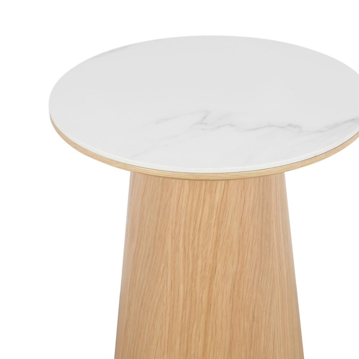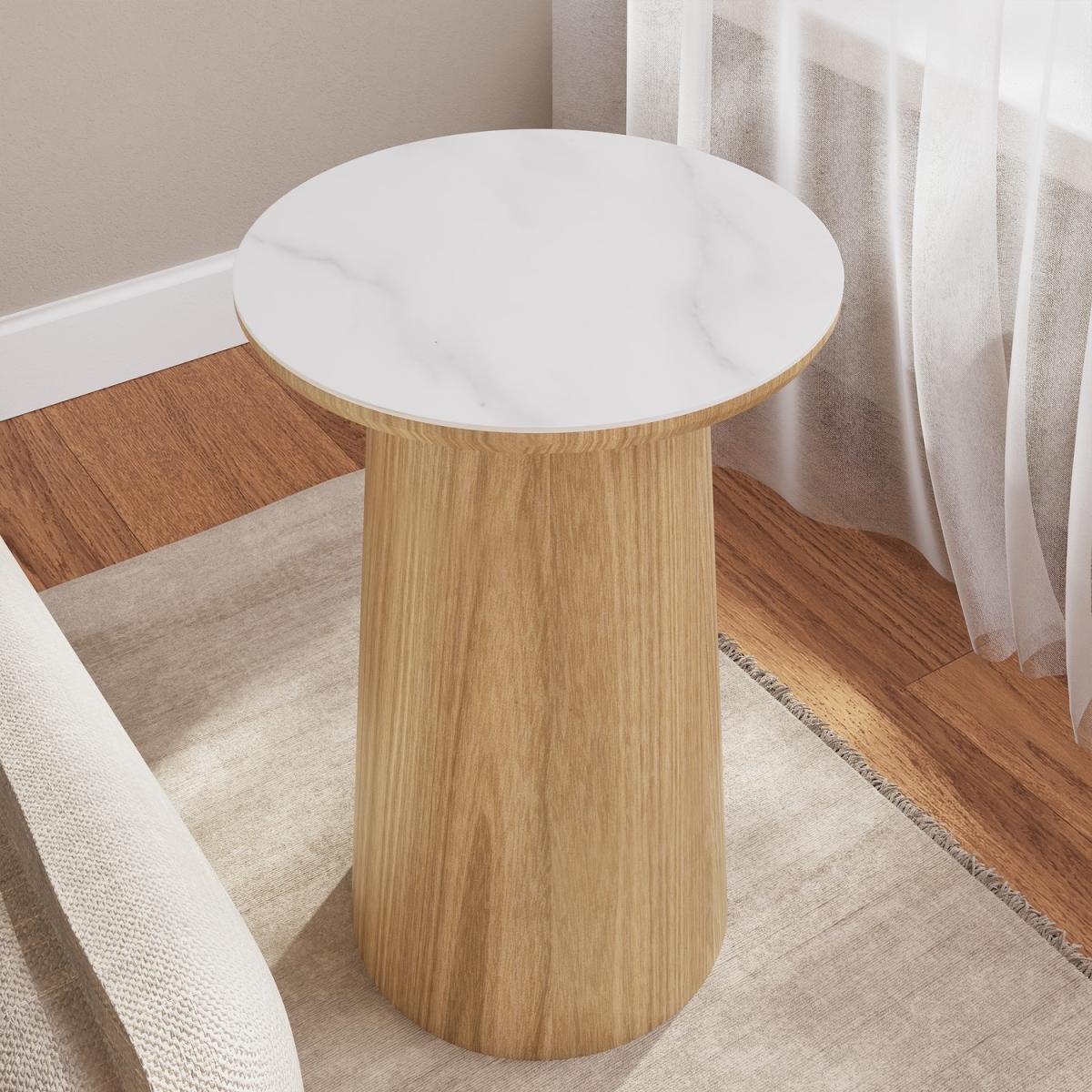The durable, heat and scratch-proof ceramic top adds a refined, practical touch to your space. A sturdy oak veneer base offers natural beauty and timeless appeal, enhancing the overall design. The white matte marble effect top adds a luxurious touch while the natural oak veneer brings warmth and balance blending seamlessly with a variety of interior styles. Ideal for small spaces, this side table fits seamlessly in various room settings. The distinctive ceramic top makes this side table a standout piece in any home. The Malia Side Table is an elegant blend of luxury and modern design. Featuring a natural oak veneer base and a ceramic top, this table adds sophistication to any room. The heat and scratch-proof ceramic surface ensures durability and practicality, while its unique design brings a touch of elegance to your living space. Due to the natural characteristics of the ceramic, marble effect, each table top is unique and may vary to images shown on site