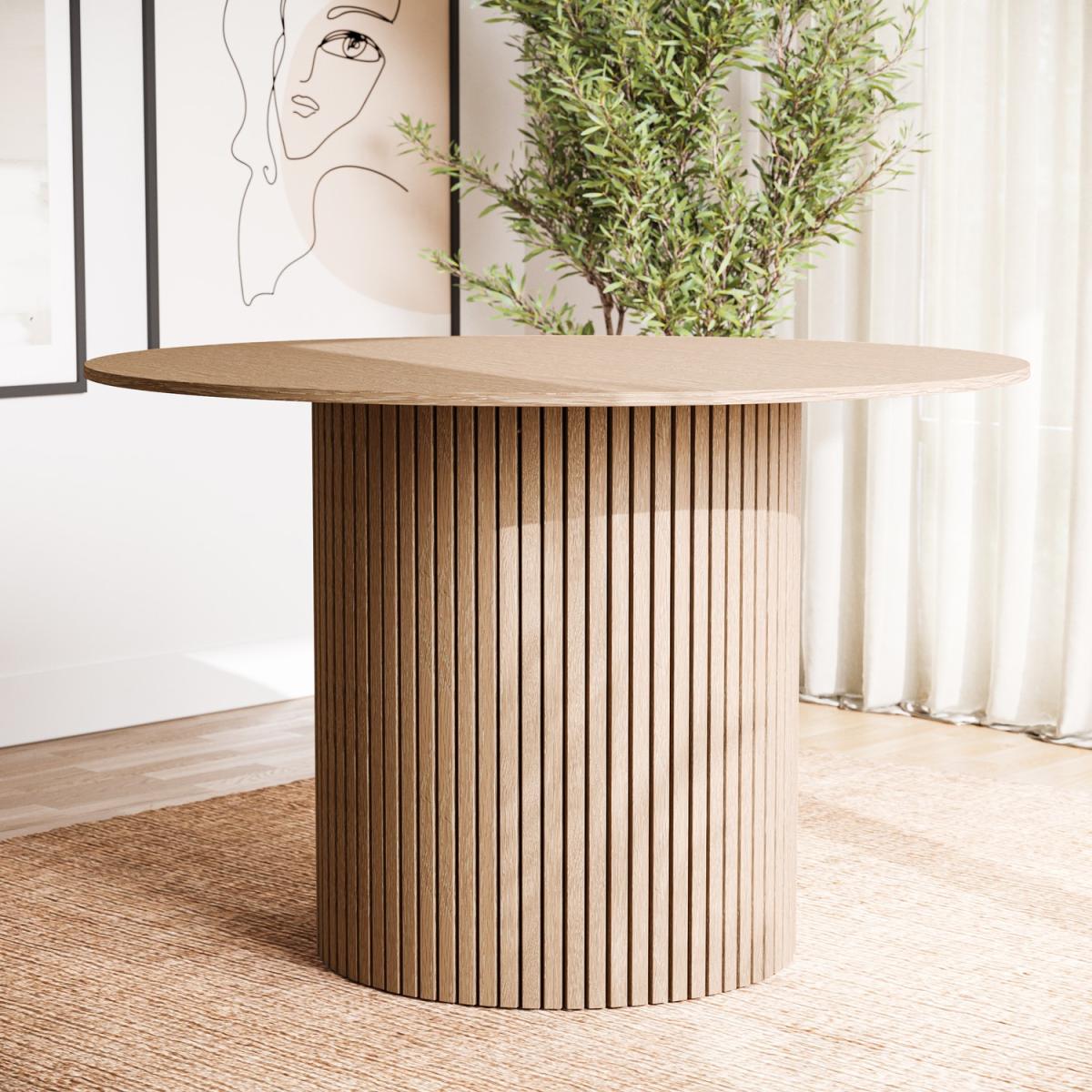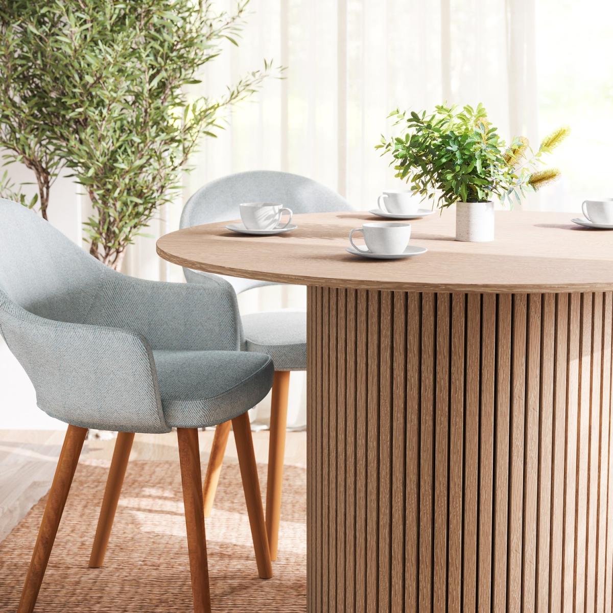 I’m a fan of this round oak table for its clean lines and warm, natural finish - it brings a casual yet refined feel without dominating the space. Its fluted cylindrical base adds subtle texture, making it a great focal point for a small dining nook or a compact open-plan area. Pair it with mismatched dining chairs in muted tones (think soft greys or deep greens) to introduce contrast, or keep everything in pale woods and linen upholstery for a Scandi-inspired look. To style, position a low-profile vase of fresh foliage at the centre and layer a jute rug underneath to define the area. Because it comfortably seats four, it’s practical for daily use yet versatile enough for impromptu gatherings.