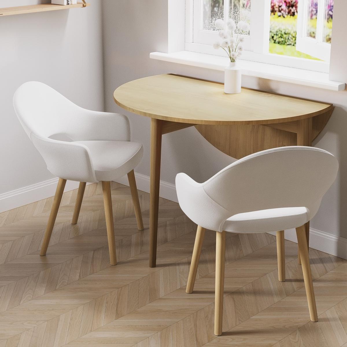 Space saving dining table for any dining space Natural wood colour with a beautiful wood grain effect Crafted with solid and veneered oak for durability Sleek, round tapered legs add a final finishing touch 2 Dining chairs upholstered in a recycled fabric White textured recycled fabric is right on trend and its sustainable Need to know Dining Table Information Seats: 2 people Product weight: 22kg Product Finish:Oak Material:MDF oak veneered and solid oak Assembly required:Yes, just the legs to affix Dining Chair Information Finish: White textured fabric with sleek oak legs Material: 74% Recycled fabric and solid rubberwood legs Number of chairs: 2 Assembly required:Yes Range:Colbie