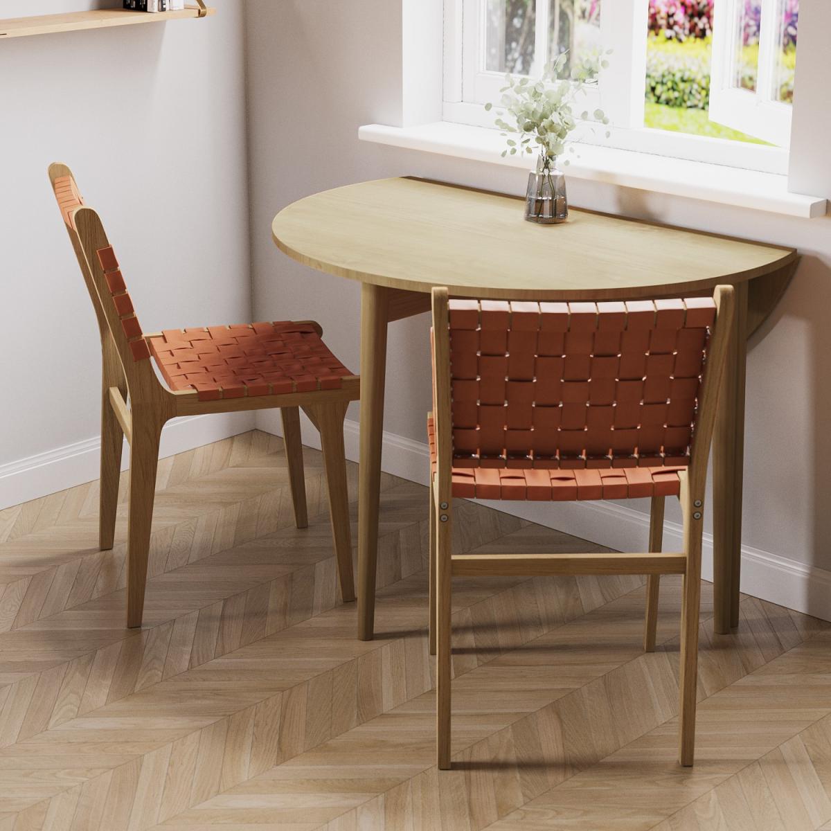 This bundle includes: 1 x Oak Drop Leaf Solid Wood Dining Table - Rudy 2 x Tan Faux Leather Dining Chairs - Bree Features we love Small drop leaf dining set for any dining or kitchenspace Oak finish with a beautiful natural wood grain effect Table seats up to4 people with the sides up Crafted with solid wood, this set is built to last The faux leather dining chairs add a retro scandi touch Need to know Dining Table Information Dimensions:W100 x D30/100 x H75 cm Weight: 22kg Max supported weight: 100kg Shape: Round (when extended) Seats: 2-4 (set includes 2 chairs) Folding sides: 2 Colour: Natural Finish: Oak Material: MDF oak veneered and solid oak For use: Indoors Assembly required: Yes, just the legs to affix Dining Chair Information Dimensions:H87 x W49.5 x D63 (overall depth) cm Seat height: 46cm Colour: Tan Finish:Woven PU and natural painted frame Material: Solid oak wood (frame) and PU (seat and back) For use: Indoors Weight: 16kg (both) Assembly required: Yes, just the legs to attach