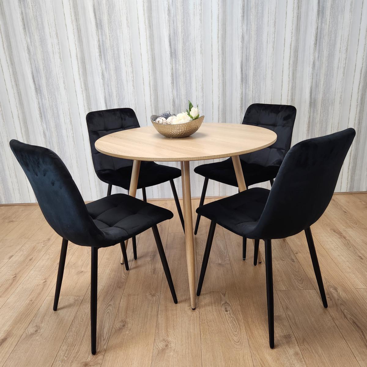 Modern round oak effect kitchen dining table and 4 black velvet tufted chairs. Transform your dining room or kitchen with this stunning modern table and chairs. The metal legs of the table are decoratively wrapped in a wood effect finish. A great addition to your dining room or kitchen that is both modern and eye-catching. This gorgeous table and chairs come in oak and black colour to compliment your dining room. A slightly curved shape is more comfortable to sit on and with lots of padding. Armless design to give a chic look and bring modern elegance to your home dining room. Flat packed, some home assembly is required, All our chairs meet fire resistance standards fast delivery to all UK. Dining Table Diameter : 90 x 90 x 75 cm(L x W x H), Chair Size: 44 x 59 x 87cm (LxWx. H).