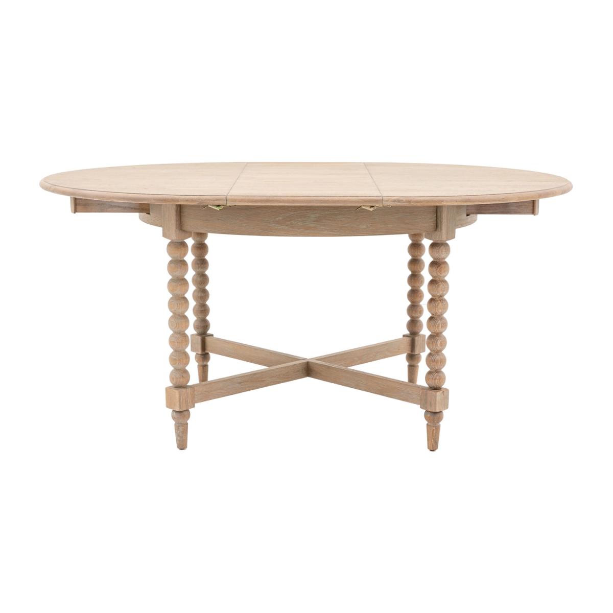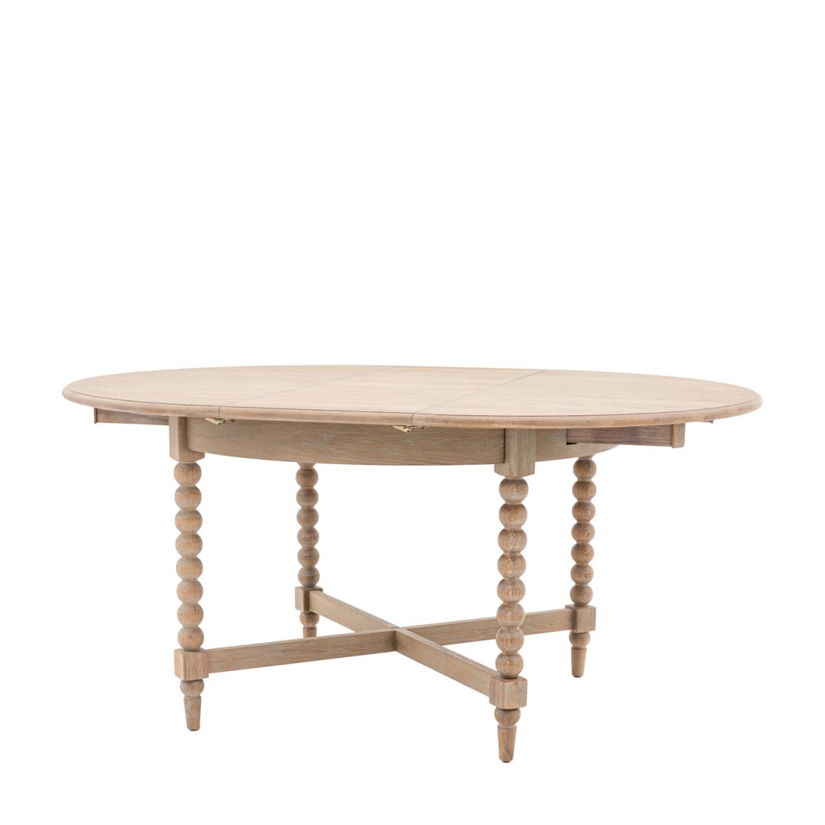 Dimensions:W120/160 x D120 x H75 cm This stunning round dining table will make a classy addition to any dining room, and with its extending top it is both beautiful and practical. The legs feature hand-crafted bobbing detail which is created by turning the wood on a lathe, a task carried out by the finest craftsmen. The table is made using beautiful oak solids and veneers where practical, with a very subtle lime wash tone to the finish which is soft and mellow. Matching pieces are available. Features: Natural oak Feet Height 72.5cm bobbing detail legs Seats 6 Round Matching items available Some assembly required