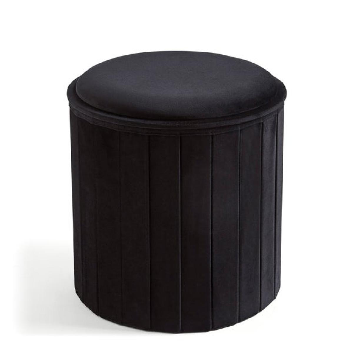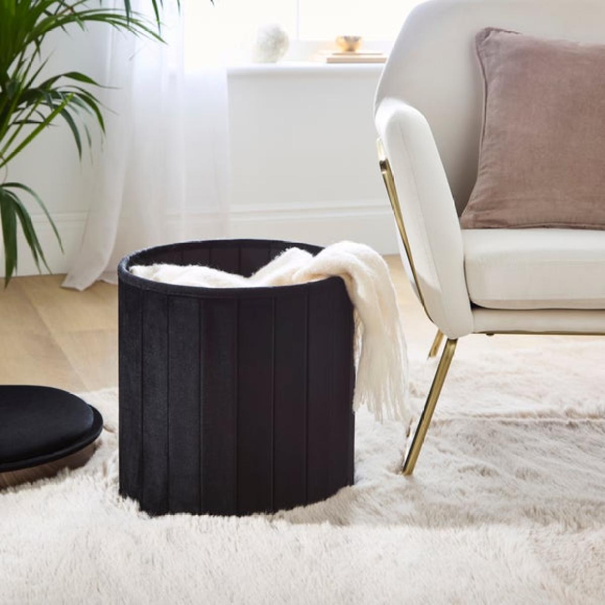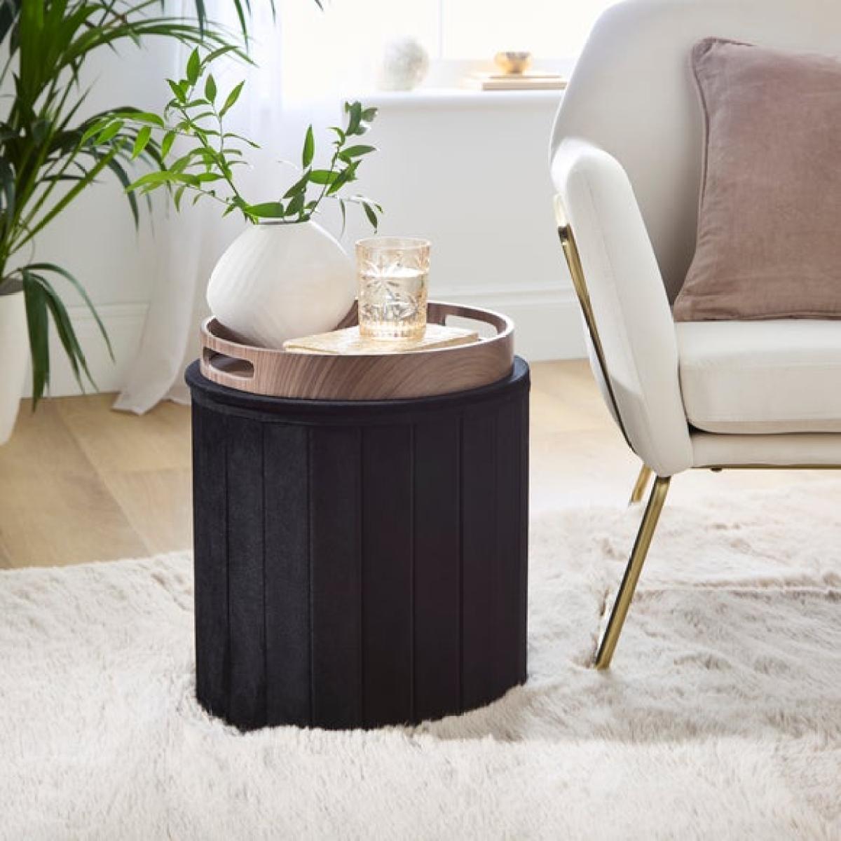 * Velvet material * Includes tray lid * Available in multiple colours * Made from polyester Indulge in velvet sophistication with this versatile round ottoman. Whether you're using it as a comfy seat, a storage box, or a footrest, it’s designed to blend seamlessly into any space. The removable tray adds even more functionality—perfect for serving drinks or displaying décor.