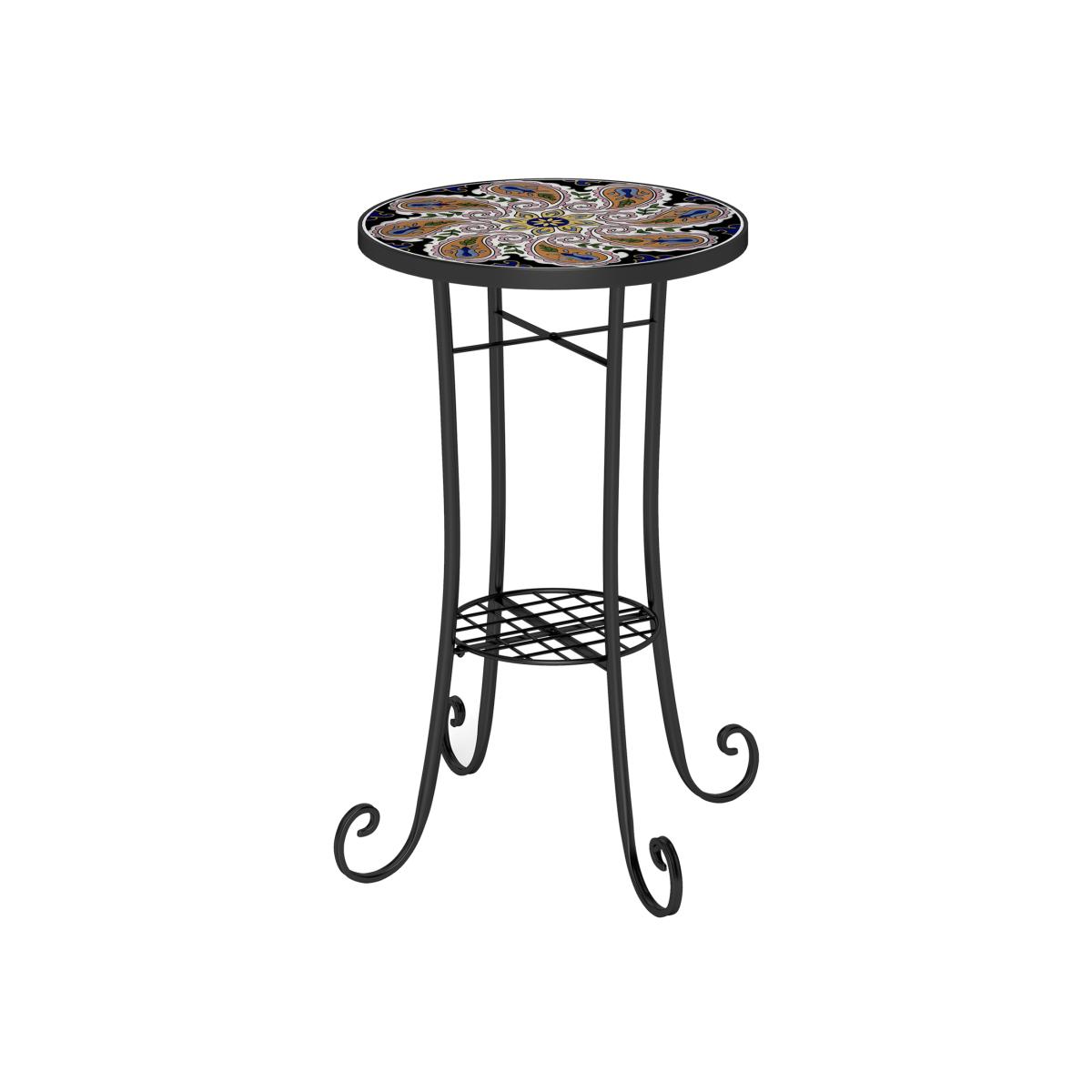 This small garden table is covered with stunning colourful ceramic tile and supported by elegantly curved legs - add a pop of charm to your patio or garden. Supporting up to 10 kg, the small outdoor coffee table provides additional space to showcase your favourite plants or decorative accents with ease. Built with an electrophoretic finish, this balcony table offers superior protection against the elements and rust for lasting beauty, with four legs keeping it balanced. This small garden table can serve as a garden coffee table, plant table, bistro table, or end table, a functional and elegant piece to your indoor and outdoor space. Dimensions, 54.5. H X 35.5 cm. Maximum load,Total, 40 kg. Top: 30 kg. Shelf, 10 kg. Easy to assemble.