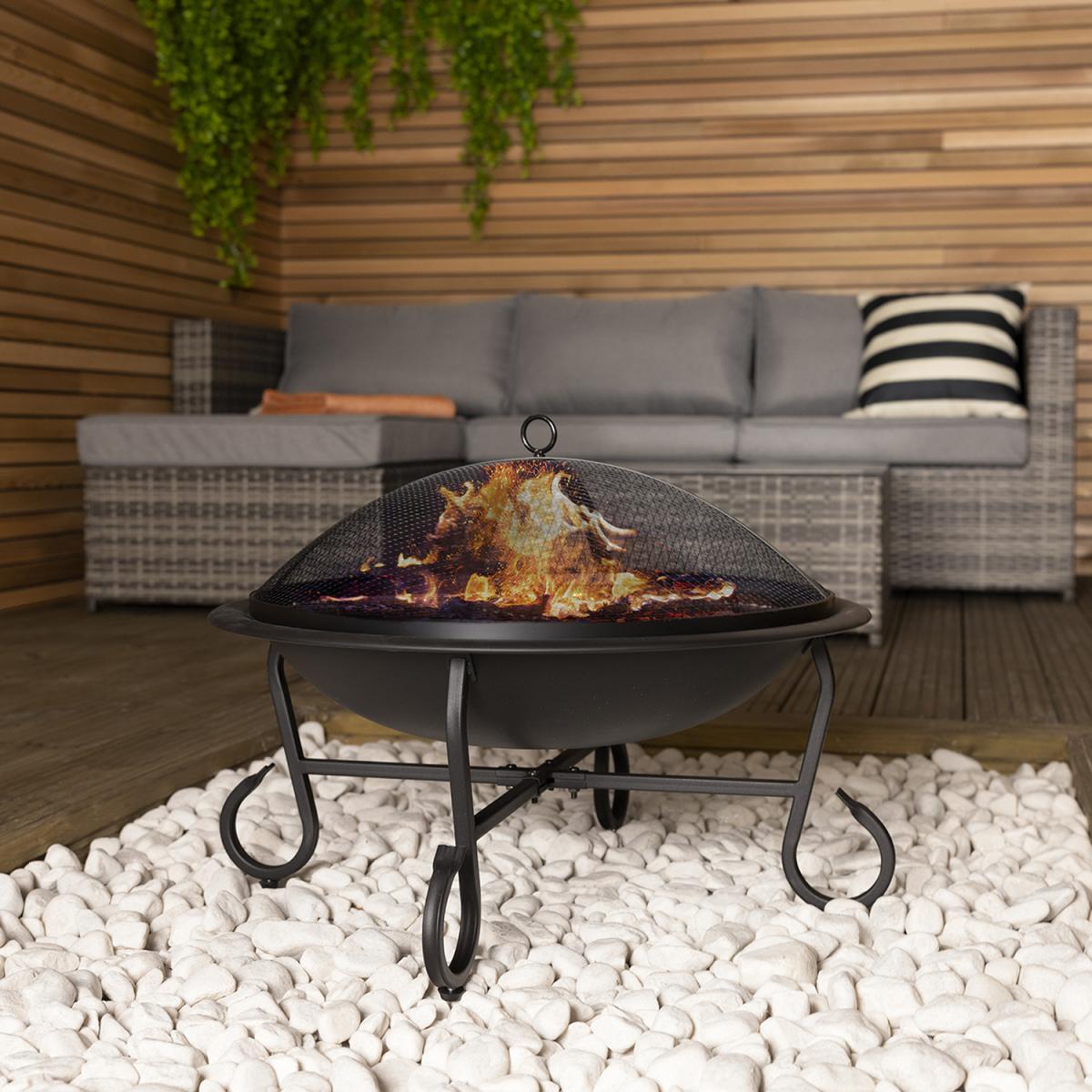 Create a cosy outdoor atmosphere, with this round steel fire pit which is perfect for providing warmth and light on those cooler evenings. Featuring a BBQ grill and mesh cover to prevent debris and sparks from escaping, this contemporary fire pit is suitable for burning both charcoal and wood. Built with enamel plating to withstand high temperatures, this portable fire pit is ideal for family camping trips and barbecues. With a lightweight design, this fire pit is easy to transport and can be easily cleaned and emptied.